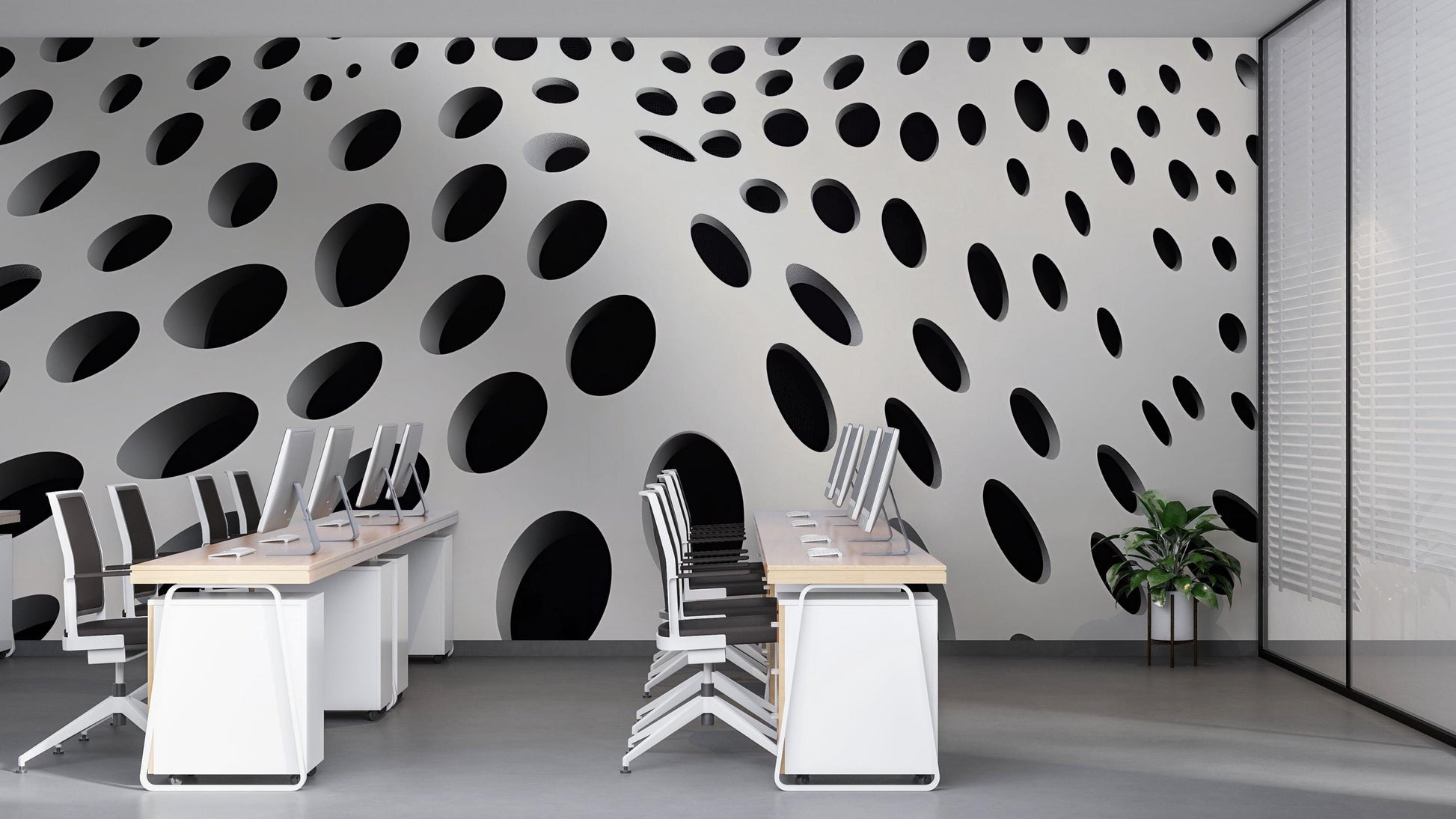 Make a bold statement with this 3D geometric wall mural, featuring black oval shapes that create a striking optical illusion. The high-contrast design adds depth and dimension, making it the perfect accent wall for offices, modern homes, studios, or creative workspaces.