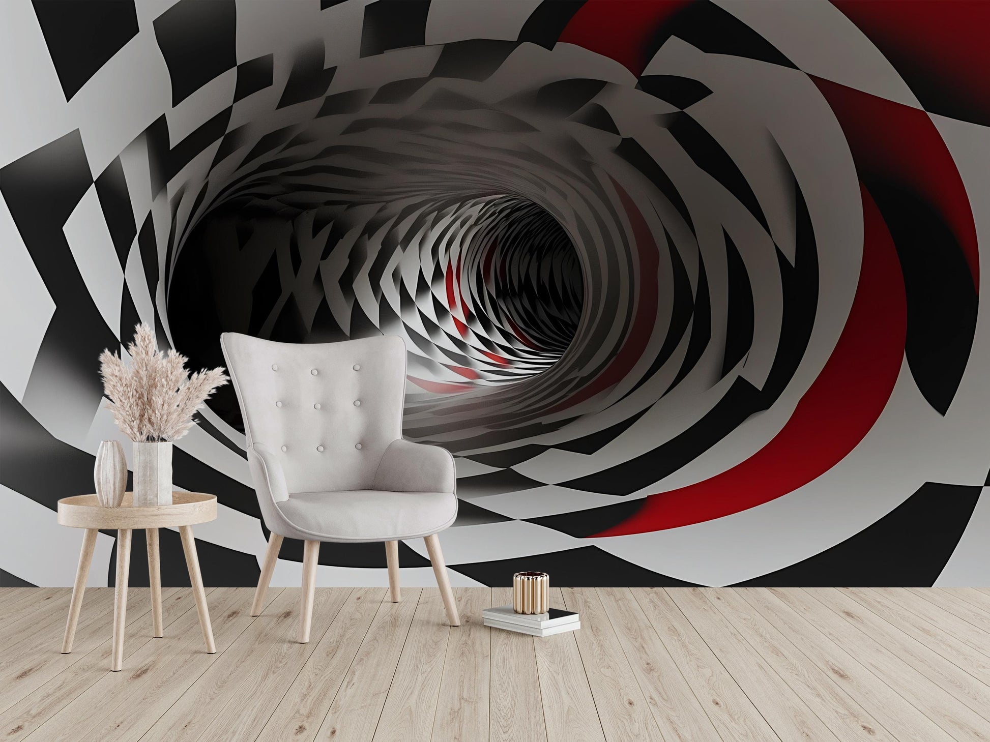 Transform your walls with this 3D Tunnel Optical Illusion Wall Mural in black, white, and red. The bold geometric design creates a mesmerizing tunnel effect that adds depth and a futuristic vibe to any room.
