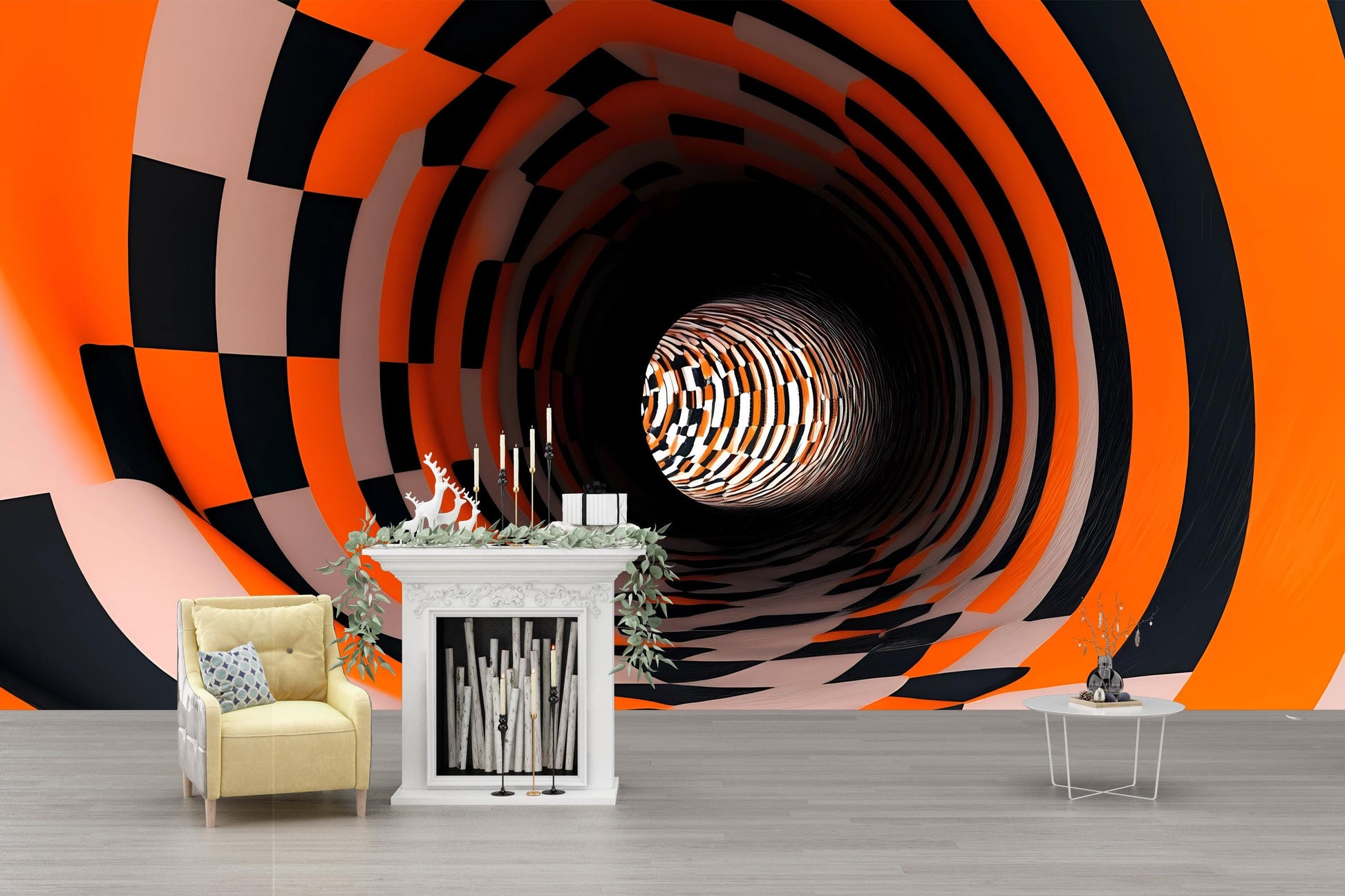 Transform your walls with this 3D tunnel wall mural, designed to create a bold optical illusion effect. The swirling orange, black, and white checkered pattern gives the impression of a deep vortex, making it a striking statement piece for living rooms, modern lofts, gaming setups, or creative offices.