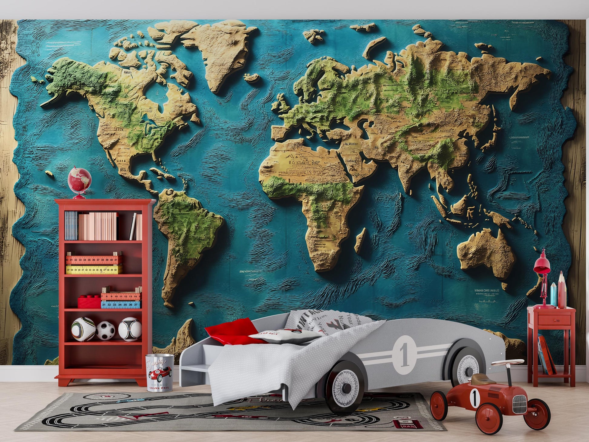 Transform your space with this stunning 3D world map wall mural—perfect for travelers, explorers, and geography lovers. Crafted with a realistic topographic design, it brings depth and texture to any room. Ideal for bedrooms, offices, or lounges with a rustic or modern touch. This mural makes a bold statement and inspires wanderlust every day.