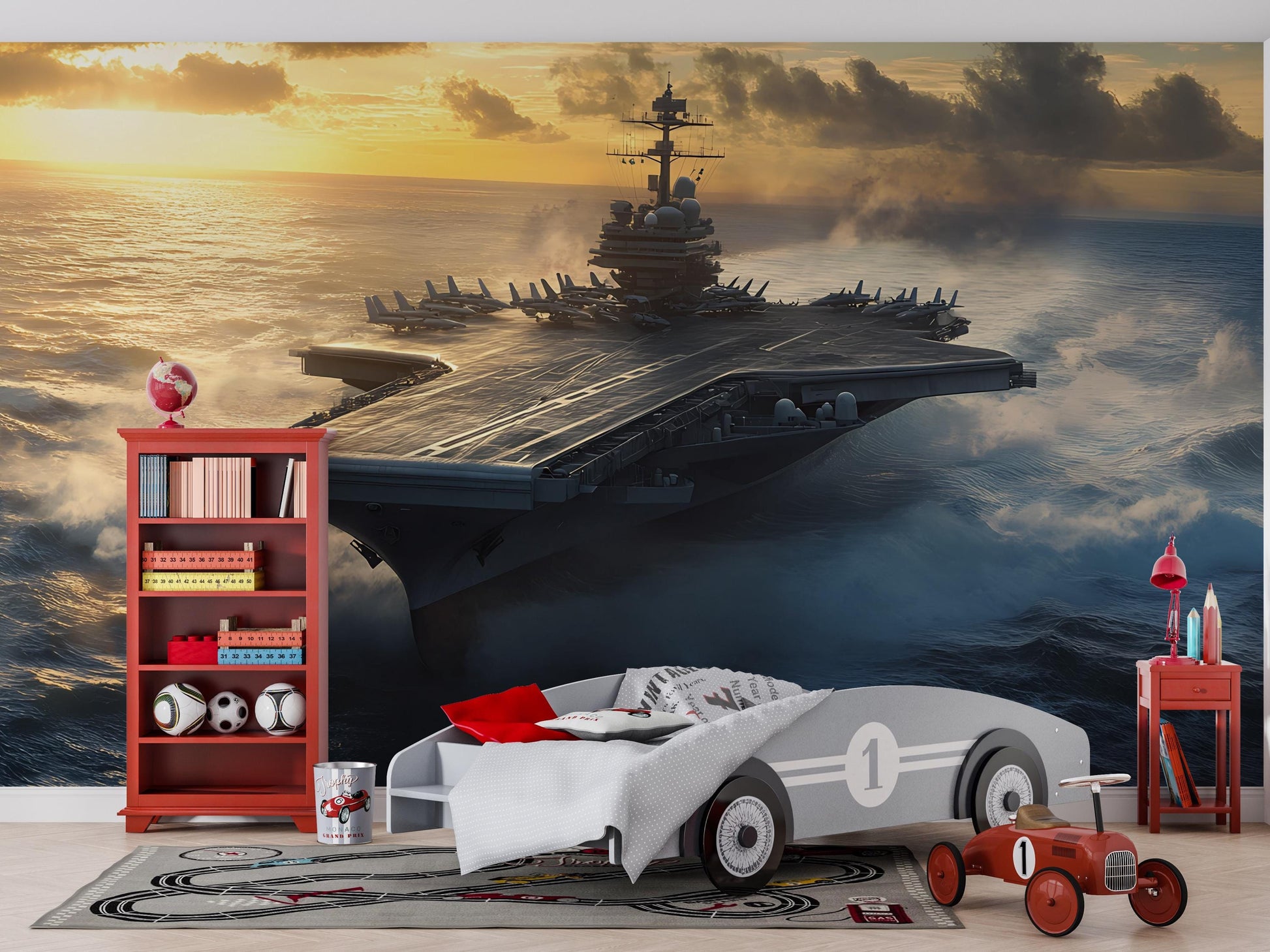 Transform your child’s room into a high-seas adventure with this stunning Aircraft Carrier Wall Mural! Featuring a realistic image of a U.S. Navy ship cruising through the ocean at sunset, this bold design is perfect for military enthusiasts, future sailors, or anyone who loves epic seascapes.