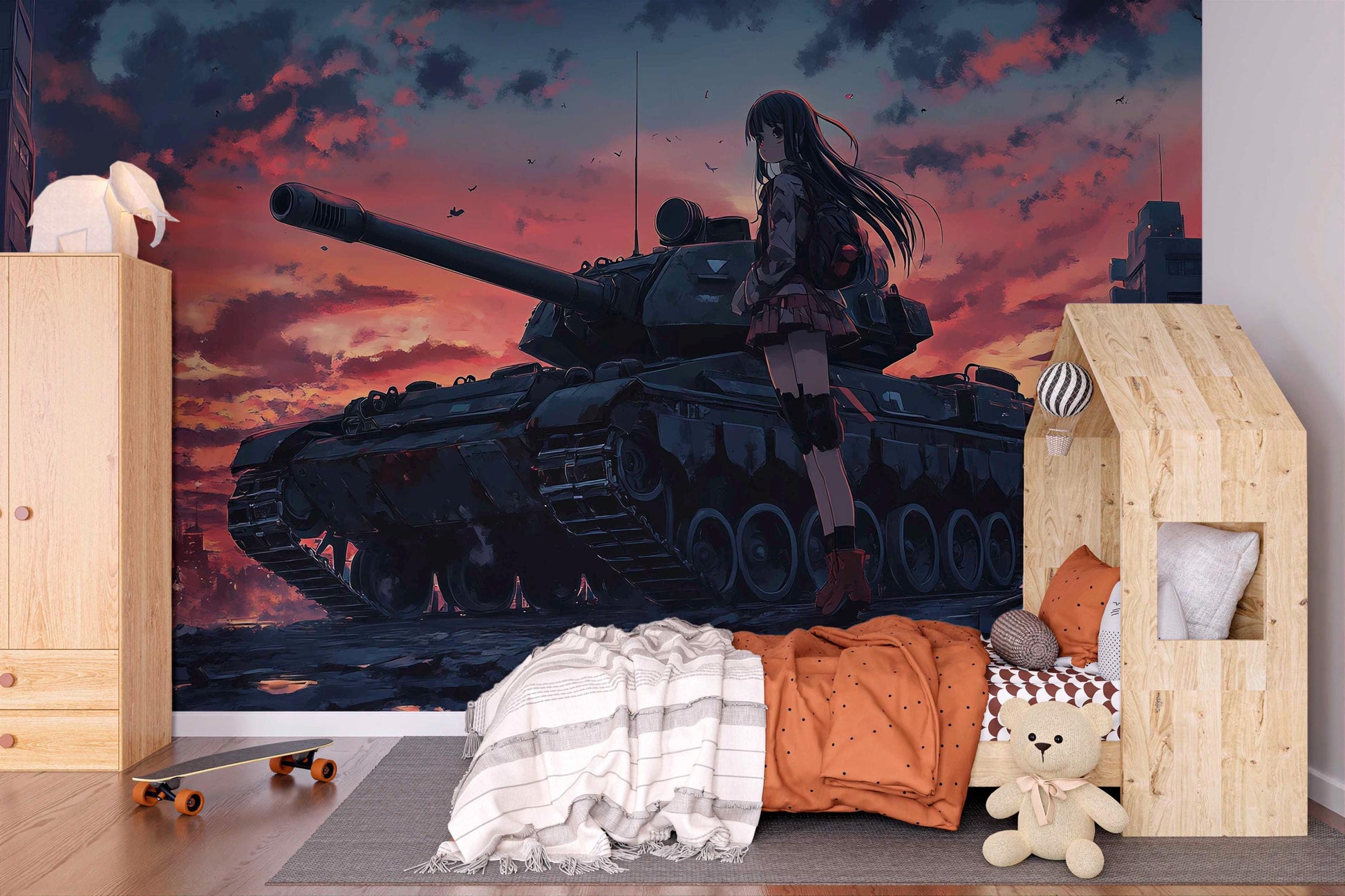 Anime Girl & Tank Wall Mural – Sunset War Scene Art, Japanese Manga Office Decor, Large Anime Wallpaper Poster
