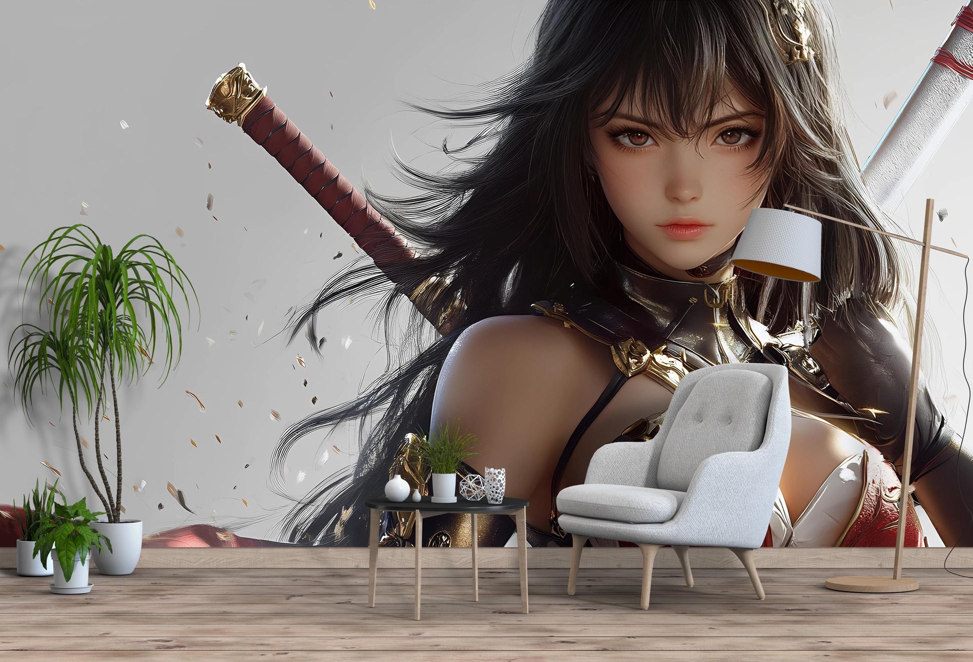 Anime Warrior Girl Wall Mural – Fantasy Sword Art Poster – Japanese Samurai Female Art Print – Modern Anime Home Decor