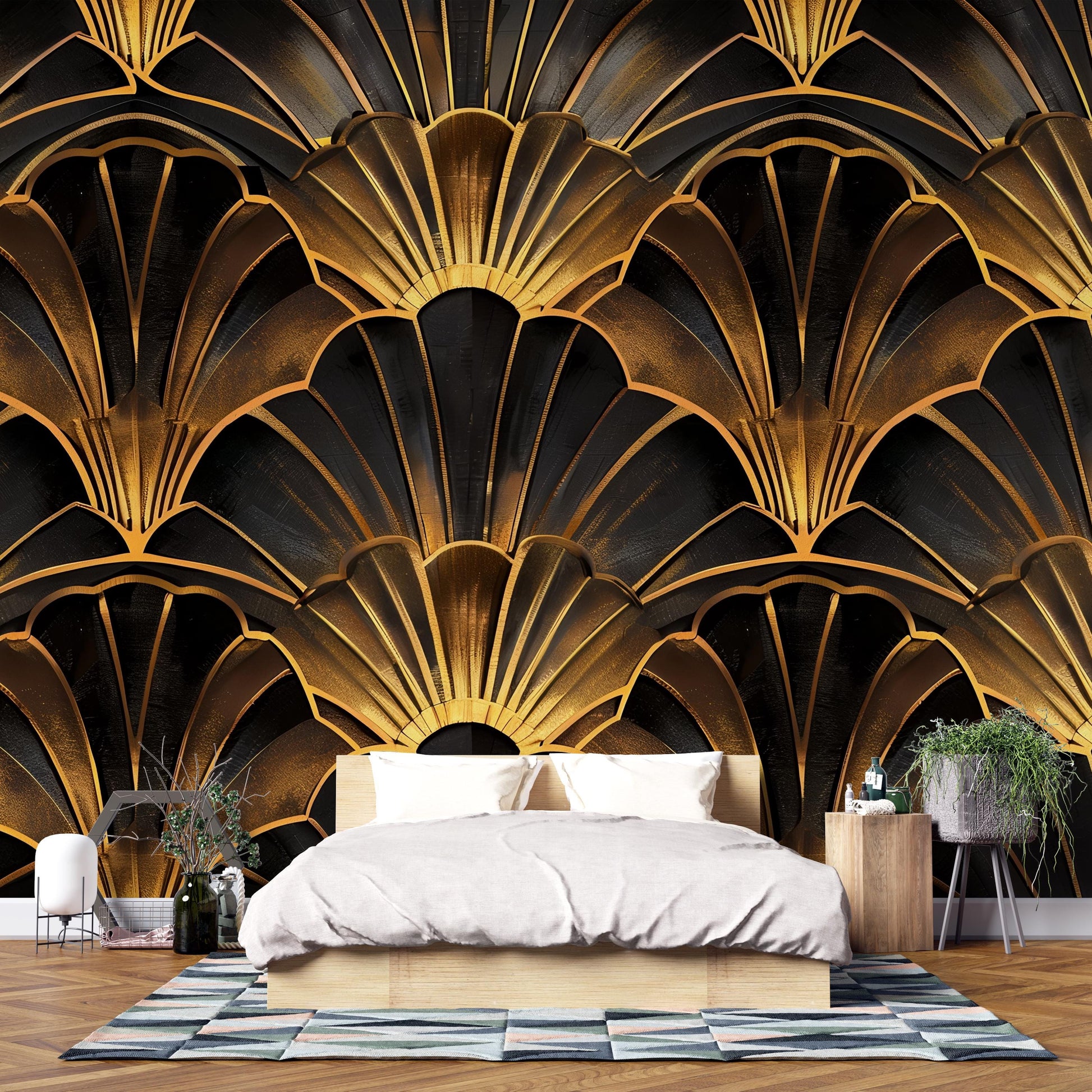 Add timeless elegance and sophistication to your space with this Art Deco Gold Scallop Fan Wall Mural. Featuring a bold 1920s-inspired fan motif in shimmering gold against a dark backdrop, this wallpaper is perfect for creating a glamorous statement wall.
