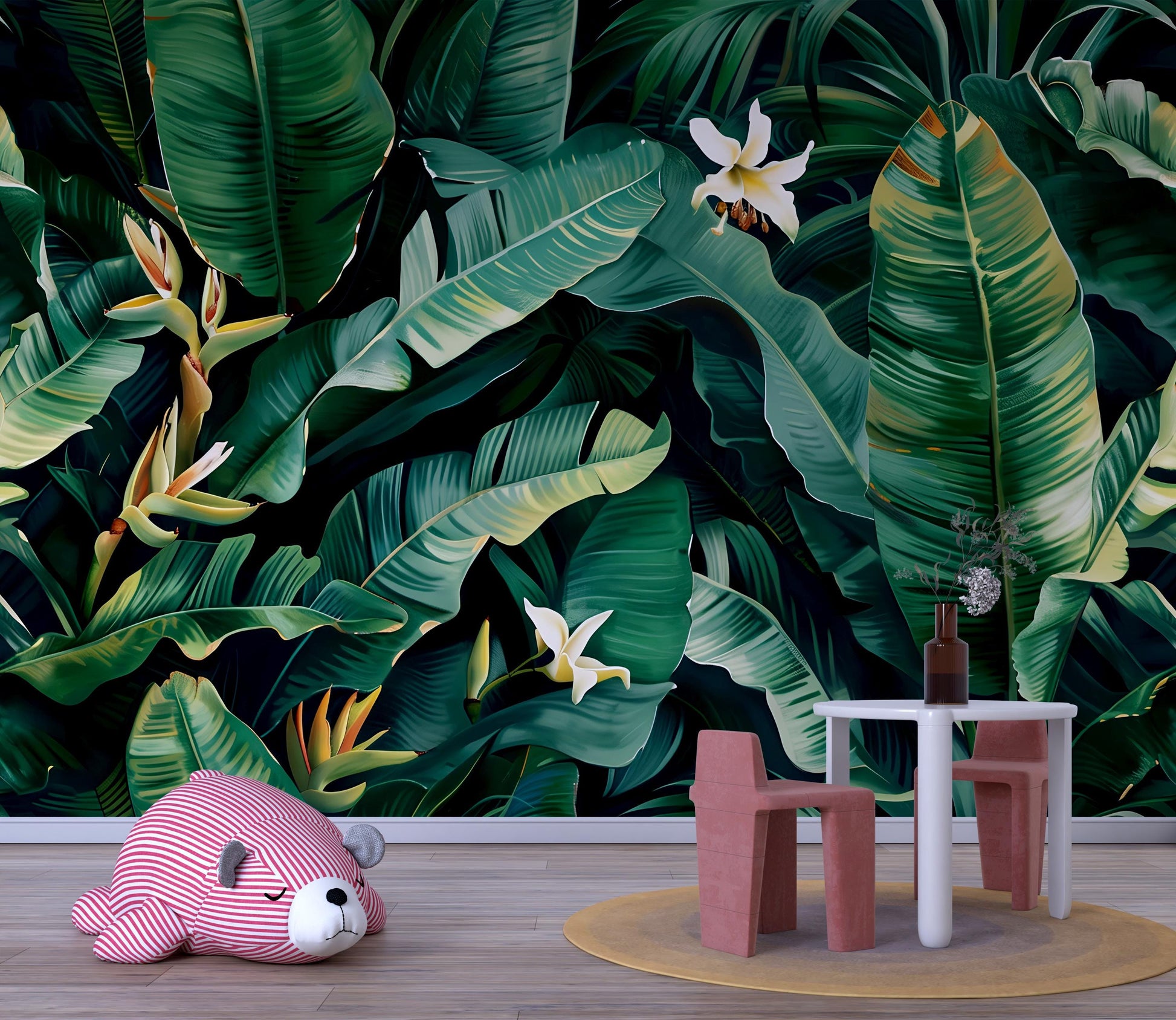 Bring the lush beauty of the tropics into your home with this banana leaf wall mural. Featuring deep green foliage and subtle tropical flowers, this botanical wallpaper creates a bold statement wall full of nature’s energy. Perfect for nurseries, kids’ rooms, living spaces, or modern boho interiors, this mural transforms any wall into a vibrant jungle escape.