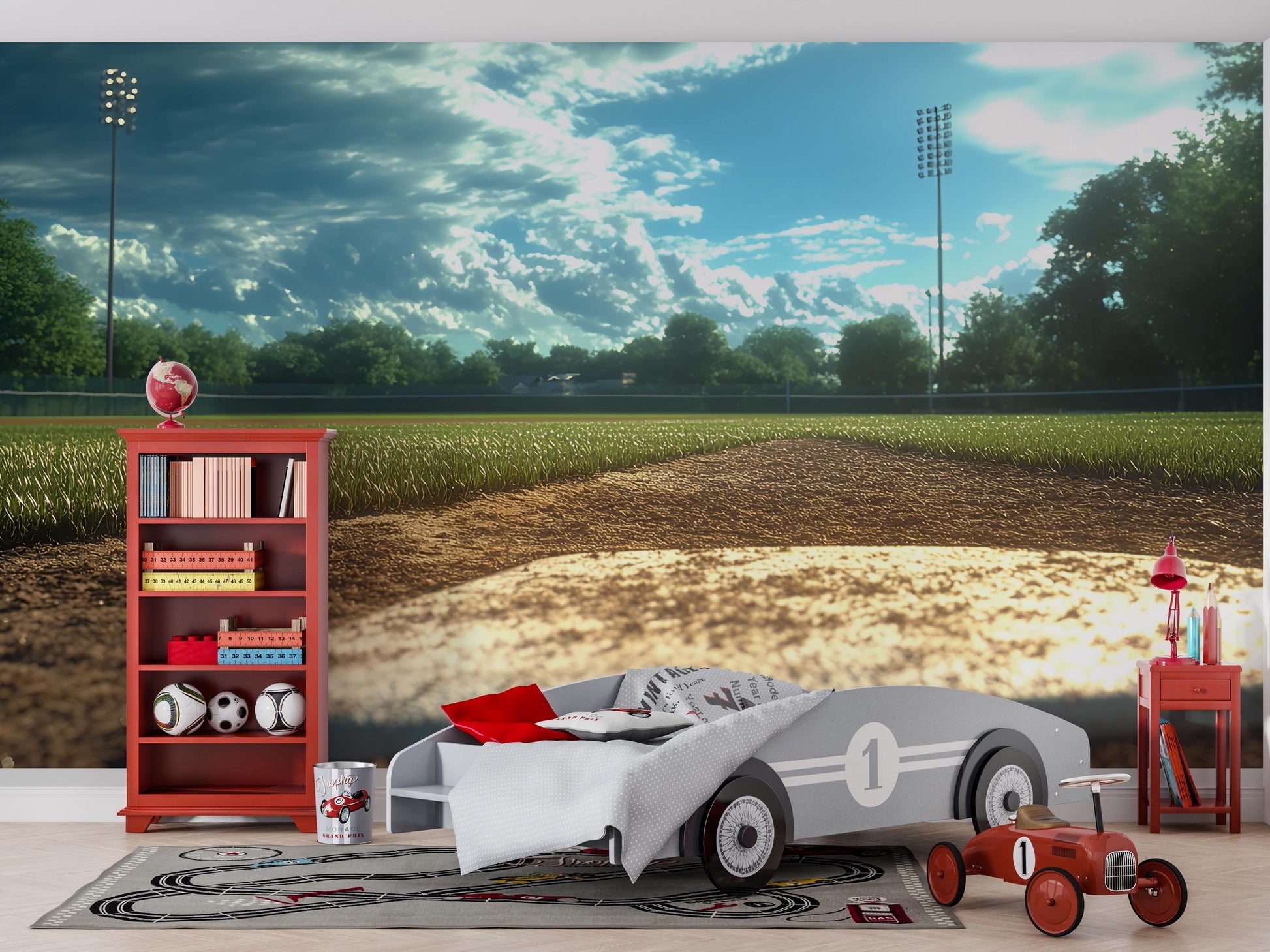 Transform your space with this stunning baseball field wall mural! Featuring a realistic view from home plate, stadium lights, and a vibrant sunset sky, this high-resolution sports-themed wallpaper is perfect for boys' rooms, man caves, game rooms, or sports bars. Designed to bring the energy of the ballpark indoors, this mural adds depth, motion, and personality to any room.