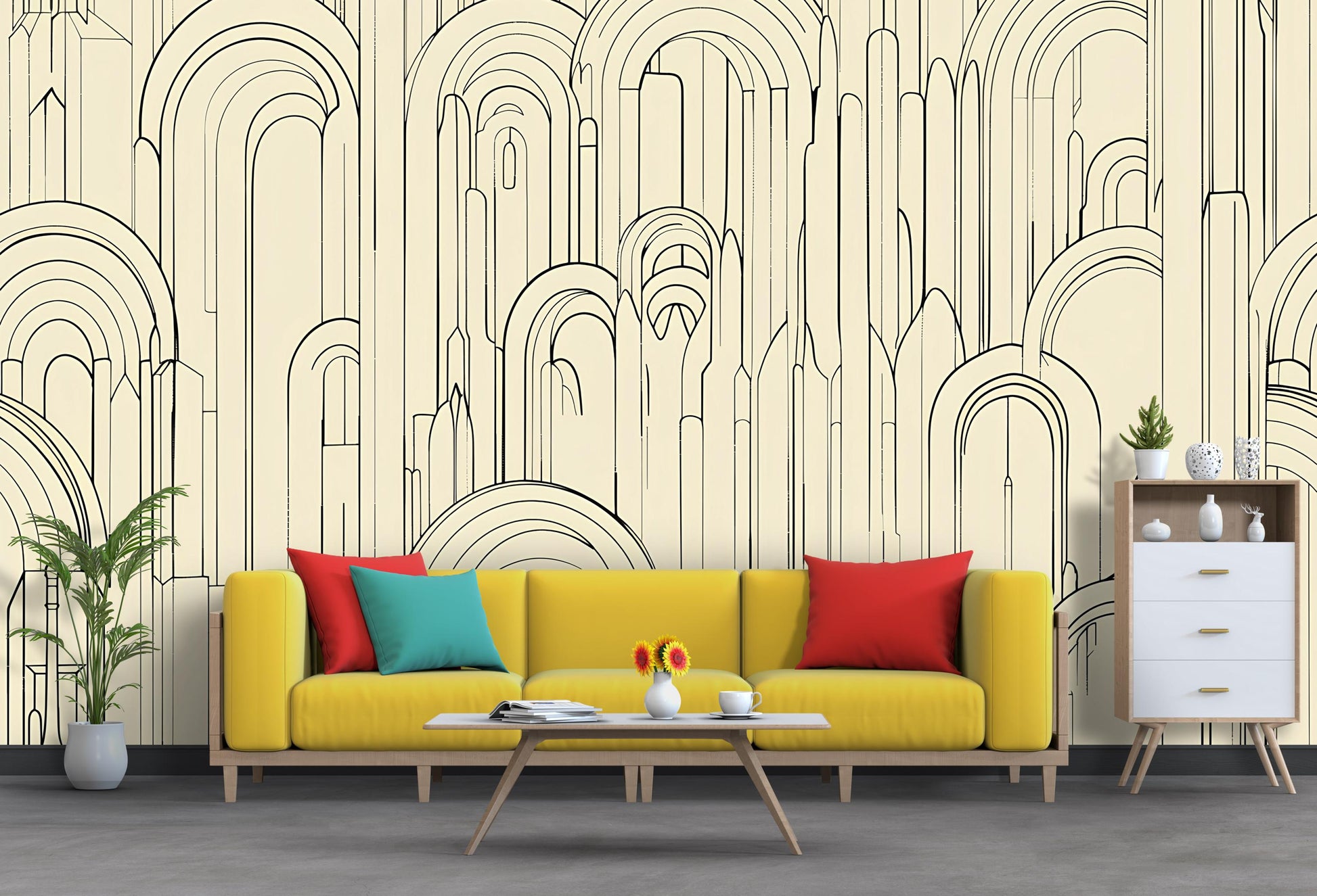 Bring a touch of modern minimalism to your home with this Beige Arch Line Wallpaper. Featuring sleek overlapping arches in fine black outlines against a soft neutral background, this mural adds depth, elegance, and architectural flair to any space.