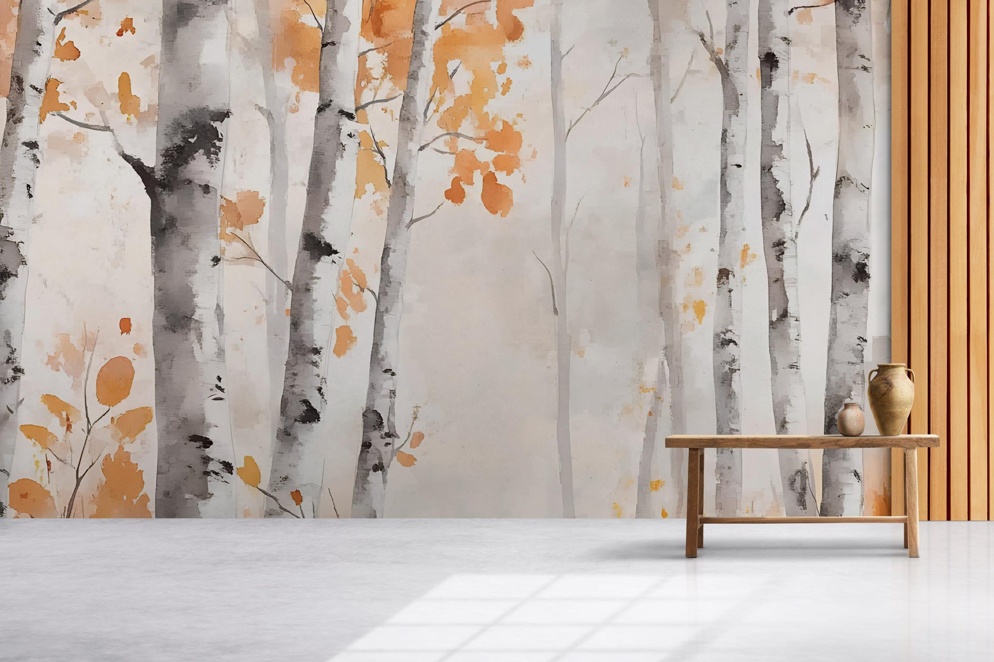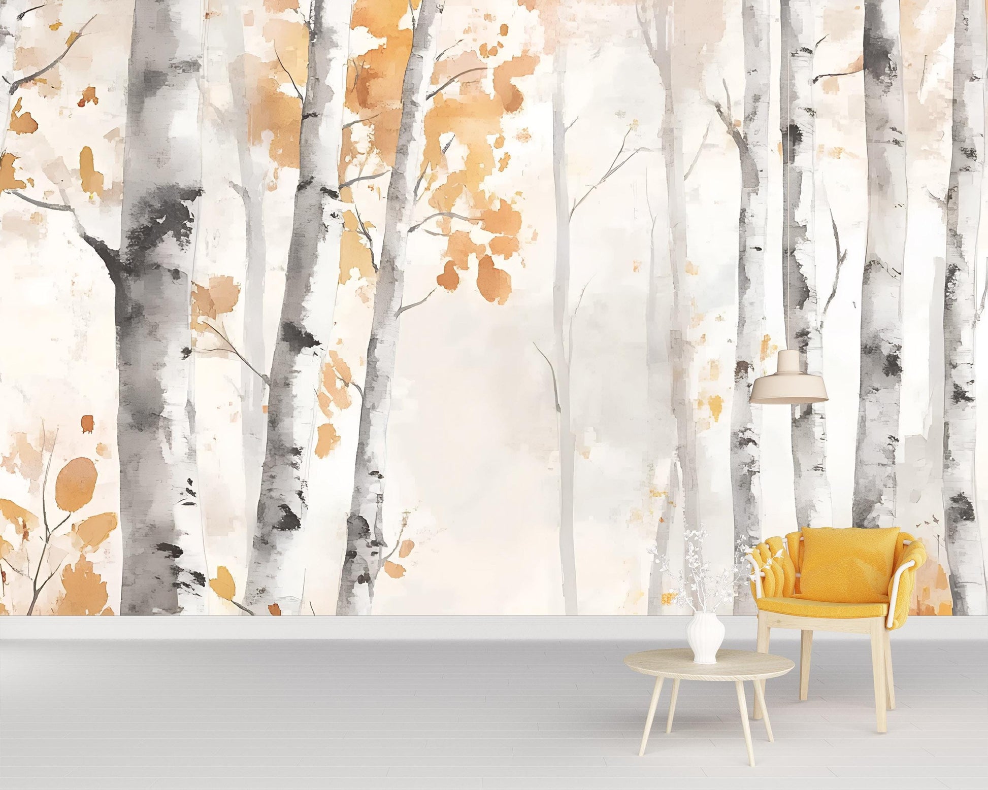 Transform your space with this stunning birch tree wall mural, featuring a serene autumn forest in warm neutral tones. This Scandinavian-inspired wallpaper brings the calm of nature indoors, making it a perfect feature wall for living rooms, bedrooms, reading nooks, or cozy corners.