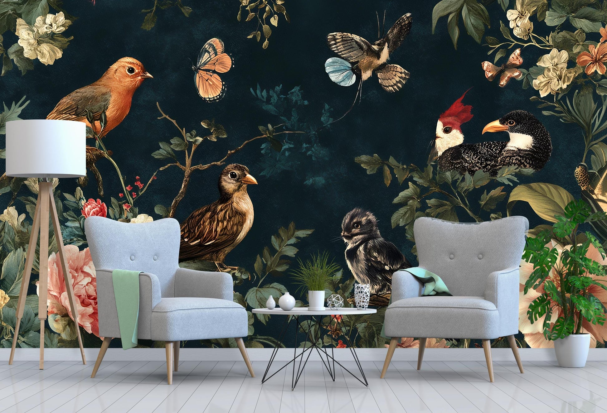 Transform your bedroom with this stunning Birds & Flowers Wall Mural. Featuring a vintage botanical design with detailed birds, butterflies, and blooming florals on a deep midnight background, this peel-and-stick wallpaper creates a bold, artistic focal point. Ideal for nature lovers and vintage-style interiors. High-resolution print on premium material ensures lasting beauty. Perfect for bedrooms, living rooms, or studio walls.