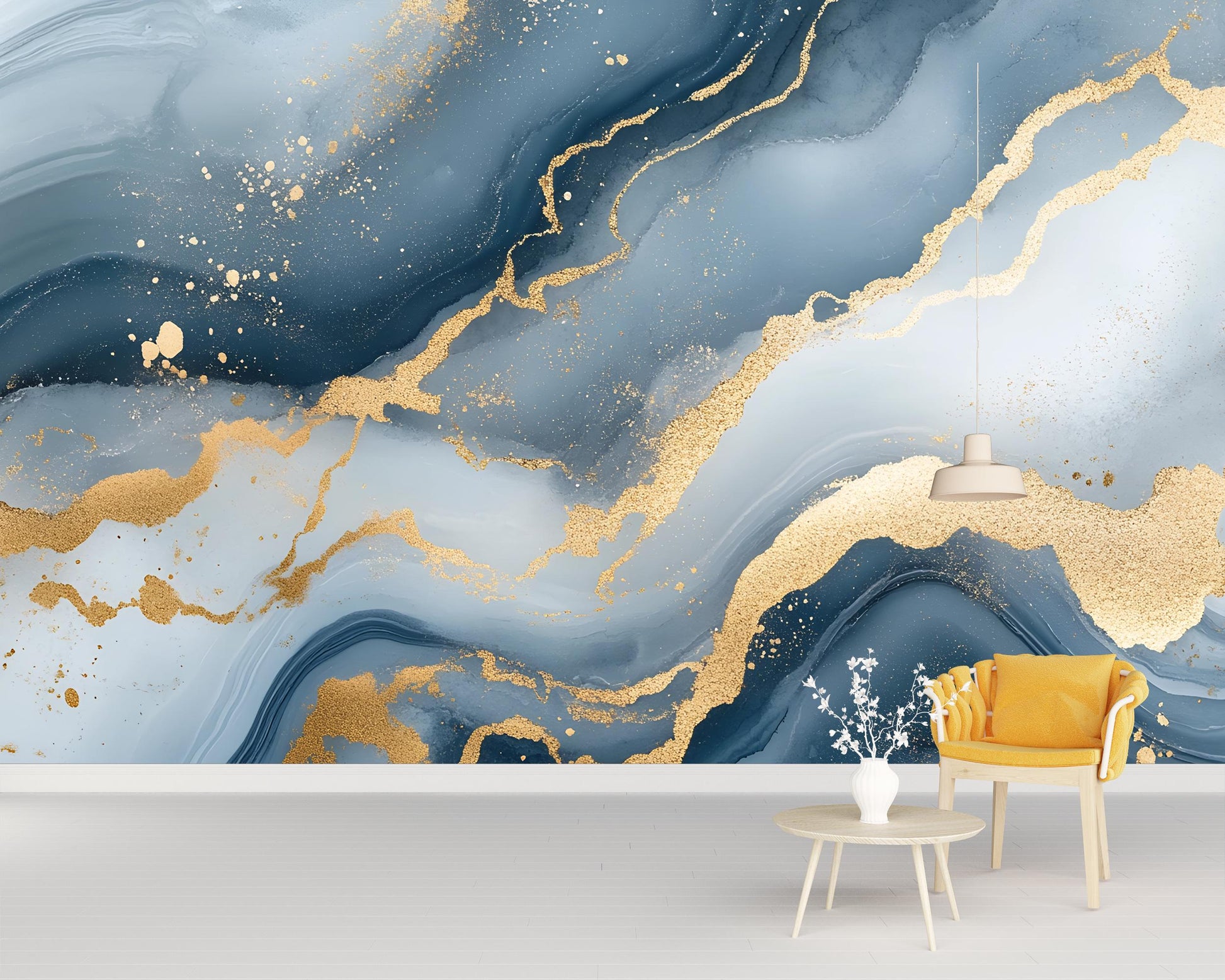 Transform your space with this stunning blue and gold marble wall mural, designed with fluid textures and shimmering metallic details. The flowing marble patterns mixed with gold splashes create a modern, luxurious statement piece for your walls.