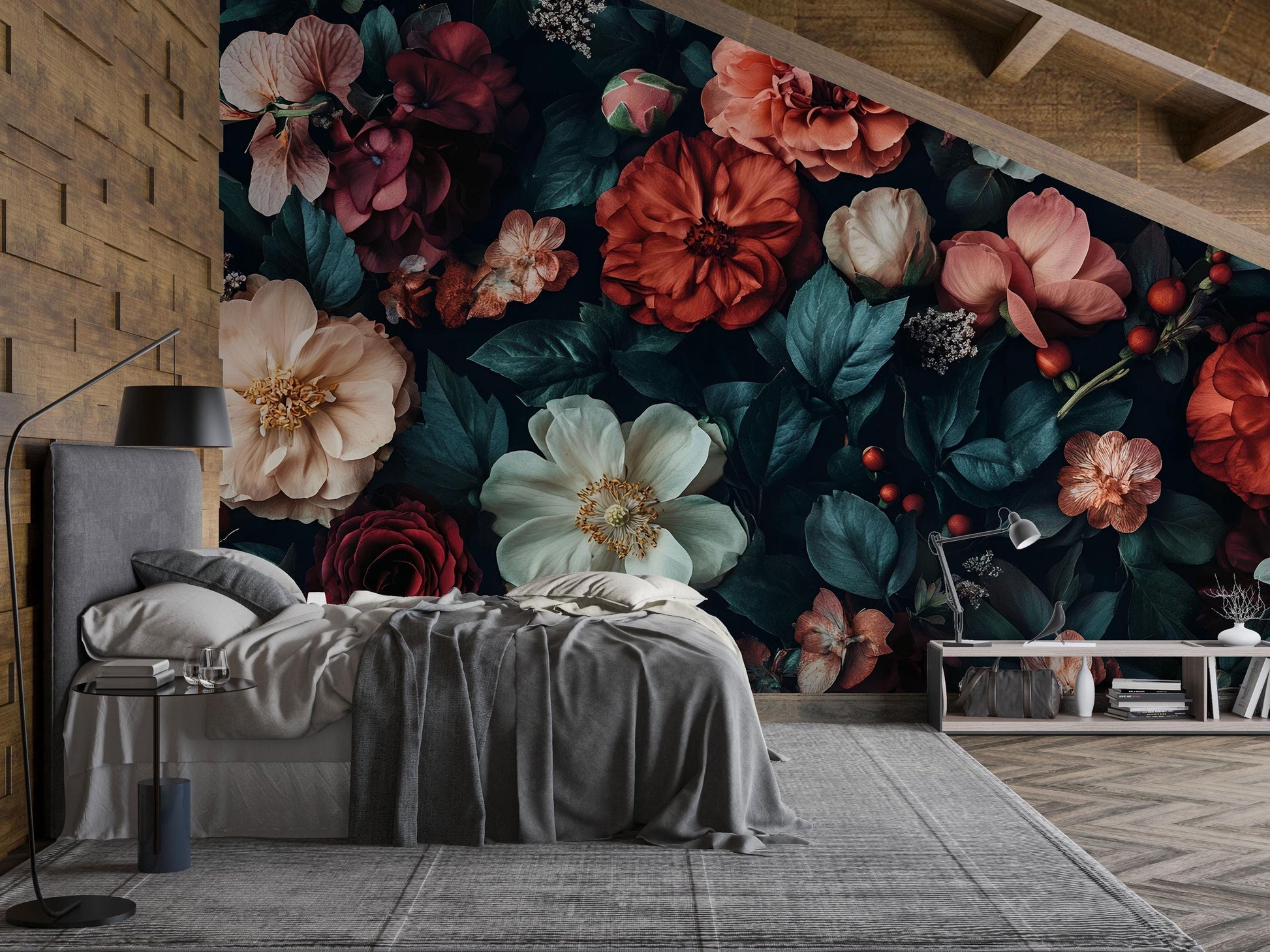 Bold Floral Wall Mural | Dark Botanical Bedroom Wallpaper | Oversized Flower Accent Wall Decor