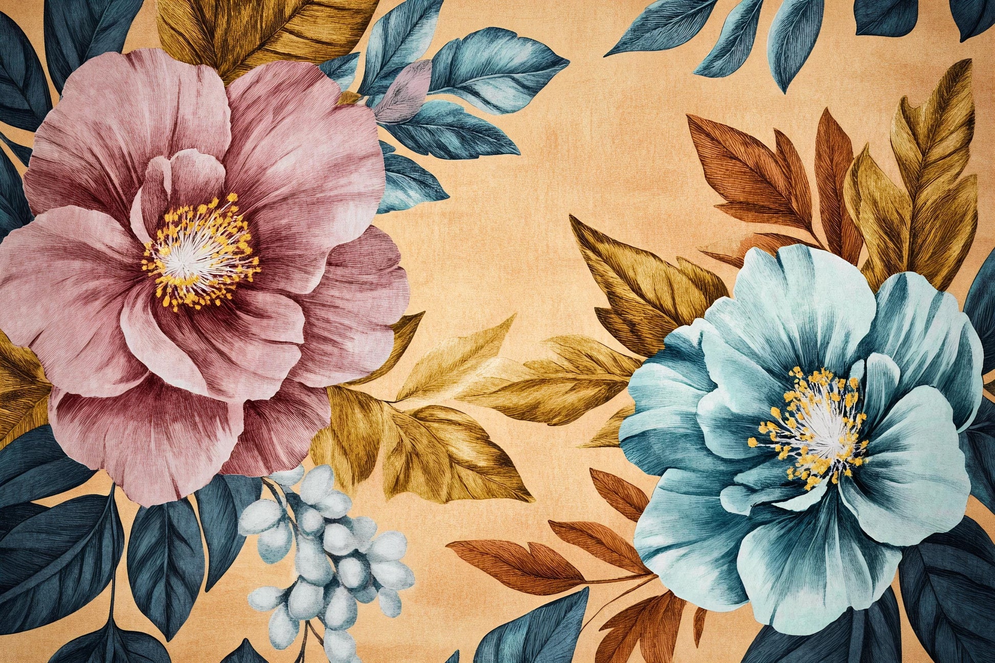 Make a dramatic statement in your home with this bold oversized floral wall mural, featuring large pink and teal-blue flowers with golden leaves on a textured warm background. Perfect for those who love modern botanical art with a vintage twist, this mural instantly transforms any wall into a breathtaking centerpiece.