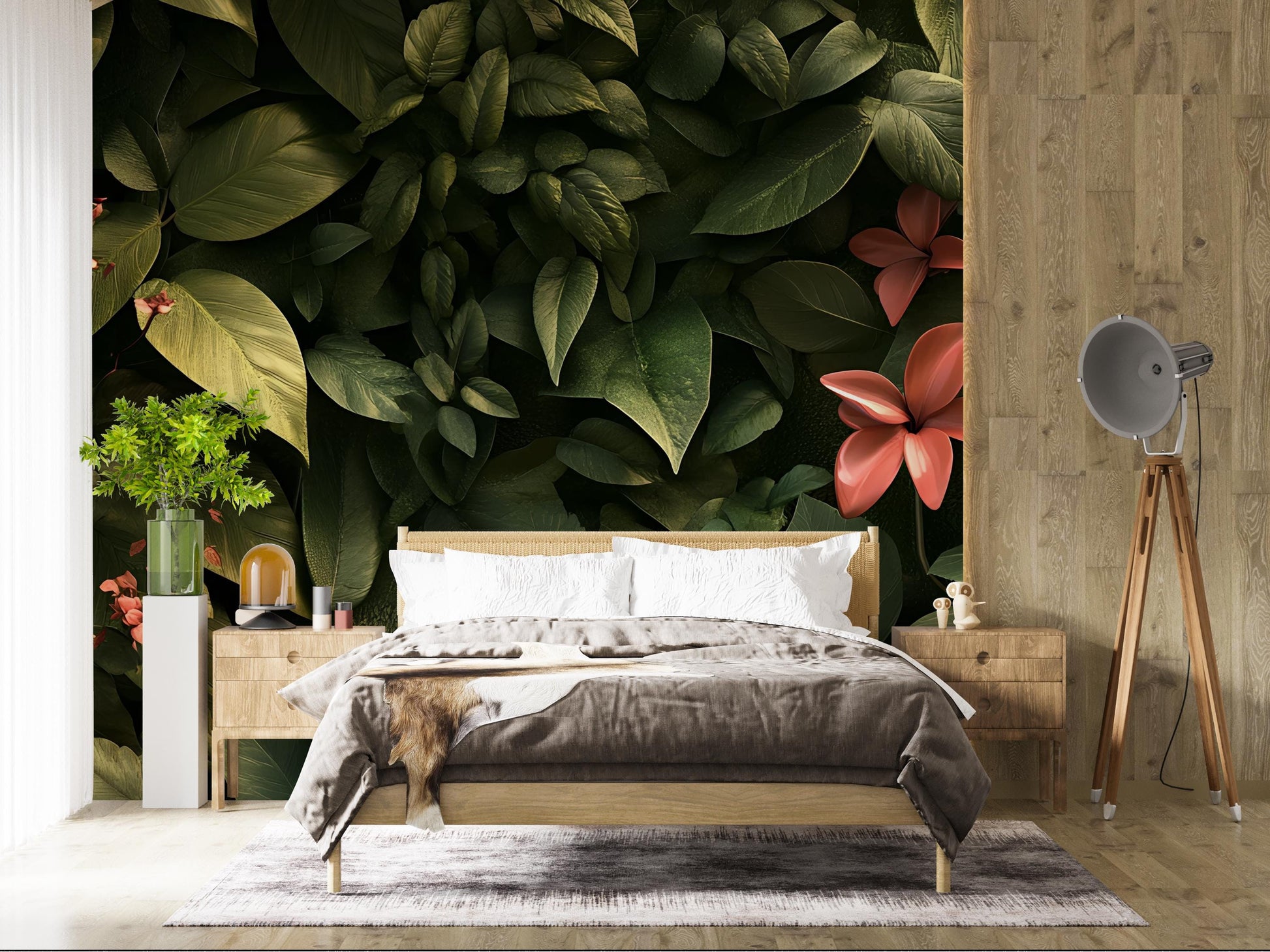 Transform your bedroom into a lush tropical retreat with this stunning botanical wall mural. Featuring vivid green jungle leaves and 3D-style coral-pink flowers, this nature-inspired wallpaper adds depth, warmth, and a serene ambiance to any space. Perfect for a boho, modern, or eco-chic interior, it's an instant room makeover for renters and homeowners alike. High-resolution print, easy peel & stick or traditional paste option.