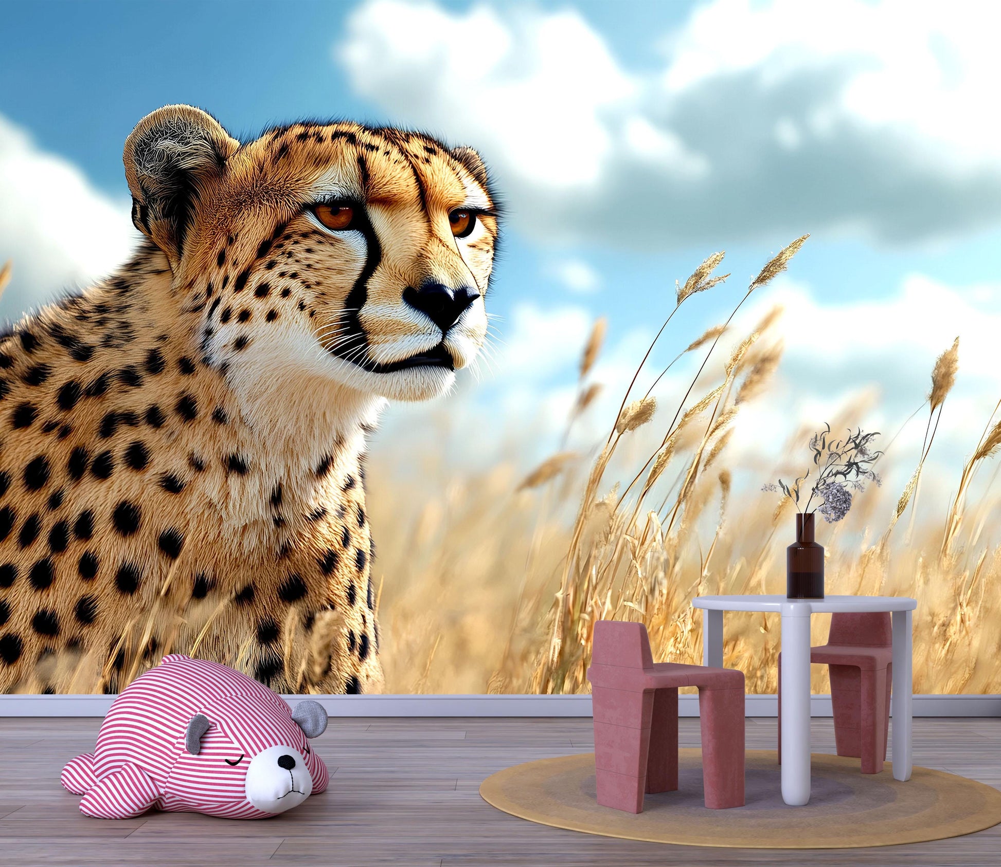 Bring the beauty of the savannah into your home with this lifelike cheetah in grassland wall mural. Featuring stunning details of the cheetah’s gaze against a backdrop of golden grass and a vivid blue sky, this high-resolution design adds warmth, depth, and a touch of adventure to any space. Perfect for nurseries, kids’ rooms, living rooms, or safari-themed interiors, it makes a bold statement wall. Available in peel-and-stick or traditional paste application, this mural is easy to install and remove, making it ideal for both renters and homeowners.