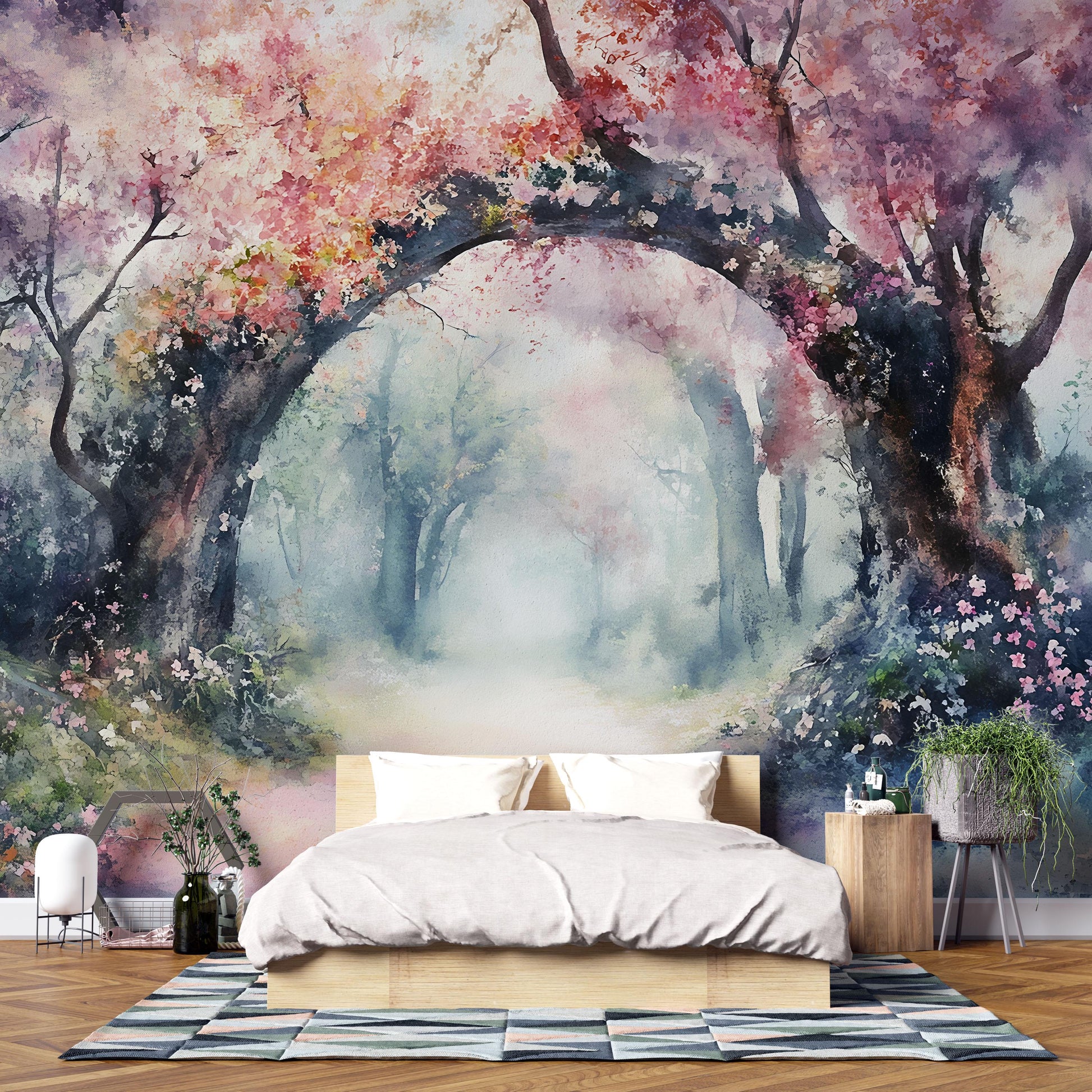 Transform your space into a tranquil retreat with this stunning cherry blossom forest mural. Painted in soft watercolor tones of pink, purple, and green, it creates the illusion of a peaceful woodland path under a floral archway. Perfect for bedrooms, living rooms, or creative studio spaces, this mural adds depth, warmth, and a sense of wonder to your home décor. Printed in high resolution for vivid detail, it’s easy to install and instantly elevates any interior style — from modern minimalist to romantic cottagecore.