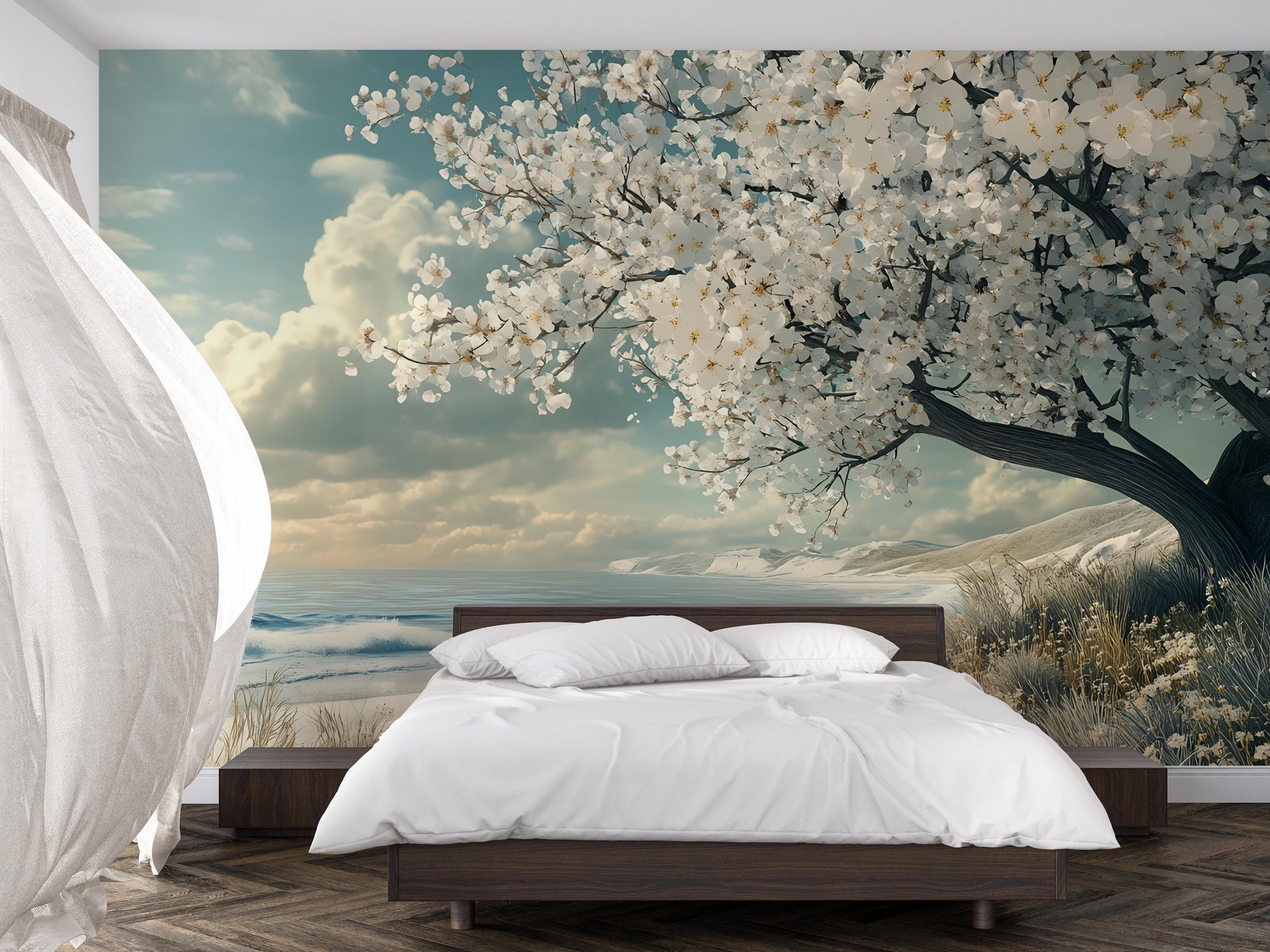 Transform your bedroom into a serene oasis with this breathtaking cherry blossom tree wall mural. Featuring delicate white blossoms against a dreamy coastal backdrop, this mural combines Japanese zen with coastal calm. Ideal for Japandi, boho, or Scandinavian interiors, this large-scale wallpaper adds elegance and tranquility to any space.