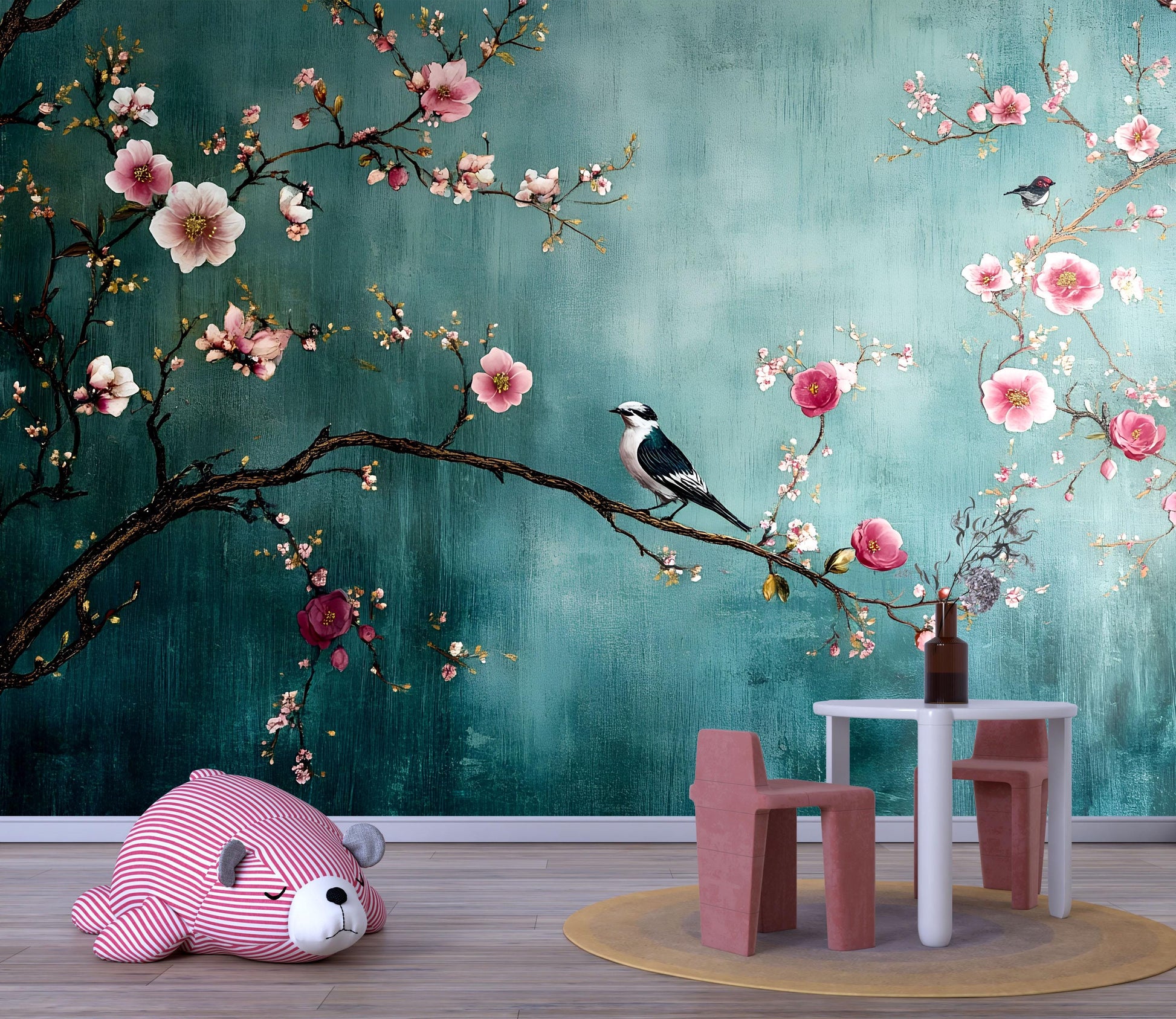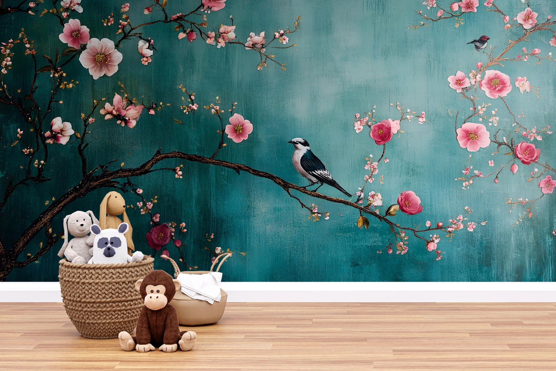 Bring the beauty of nature indoors with this cherry blossom wall mural, featuring delicate pink flowers and perched songbirds on a teal background. Perfect for creating a calming and elegant accent wall, this mural adds both charm and sophistication to nurseries, kids’ rooms, bedrooms, or living spaces.