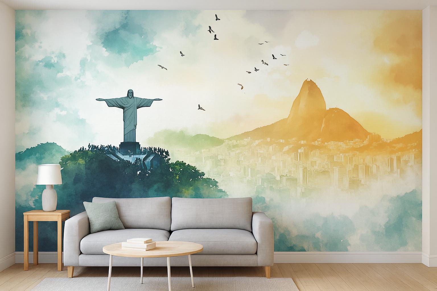 Transform your walls with this breathtaking Christ the Redeemer mural, showcasing the iconic statue overlooking Rio de Janeiro. This watercolor-style wallpaper captures the spiritual and cultural essence of Brazil, with panoramic views of the city, mountains, and Sugarloaf under a golden sky. Perfect for living rooms, bedrooms, cafes, or yoga studios, this mural brings warmth, faith, and global charm to any space.