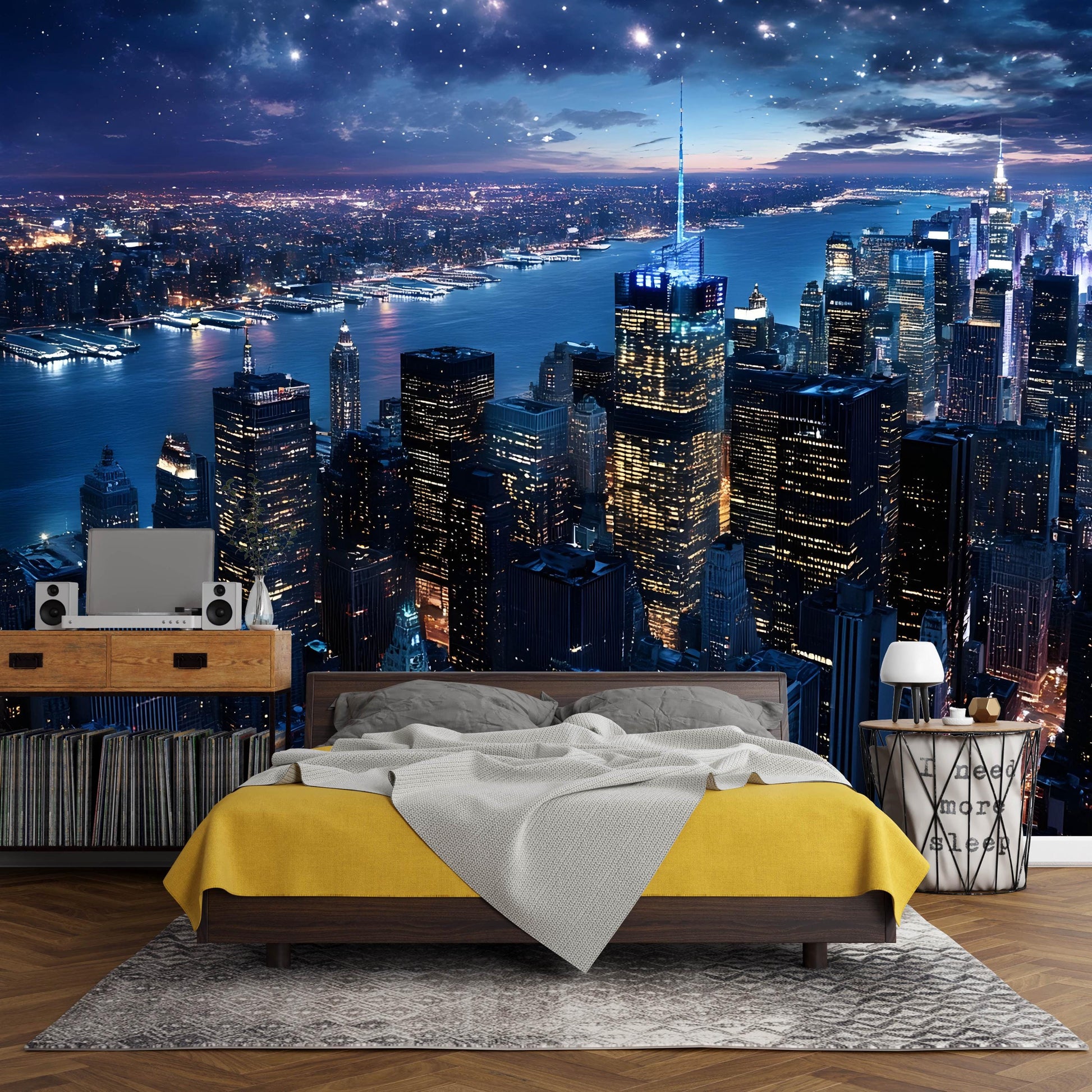 Transform your space with this stunning City Skyline Night Wall Mural, featuring a breathtaking view of New York City under a starlit sky. Perfect for bedrooms, living rooms, or office spaces, this high-resolution mural adds depth, energy, and a modern urban vibe to any interior. Printed on premium-quality wallpaper material for easy installation and long-lasting color vibrancy. Ideal for city lovers and modern home décor enthusiasts.