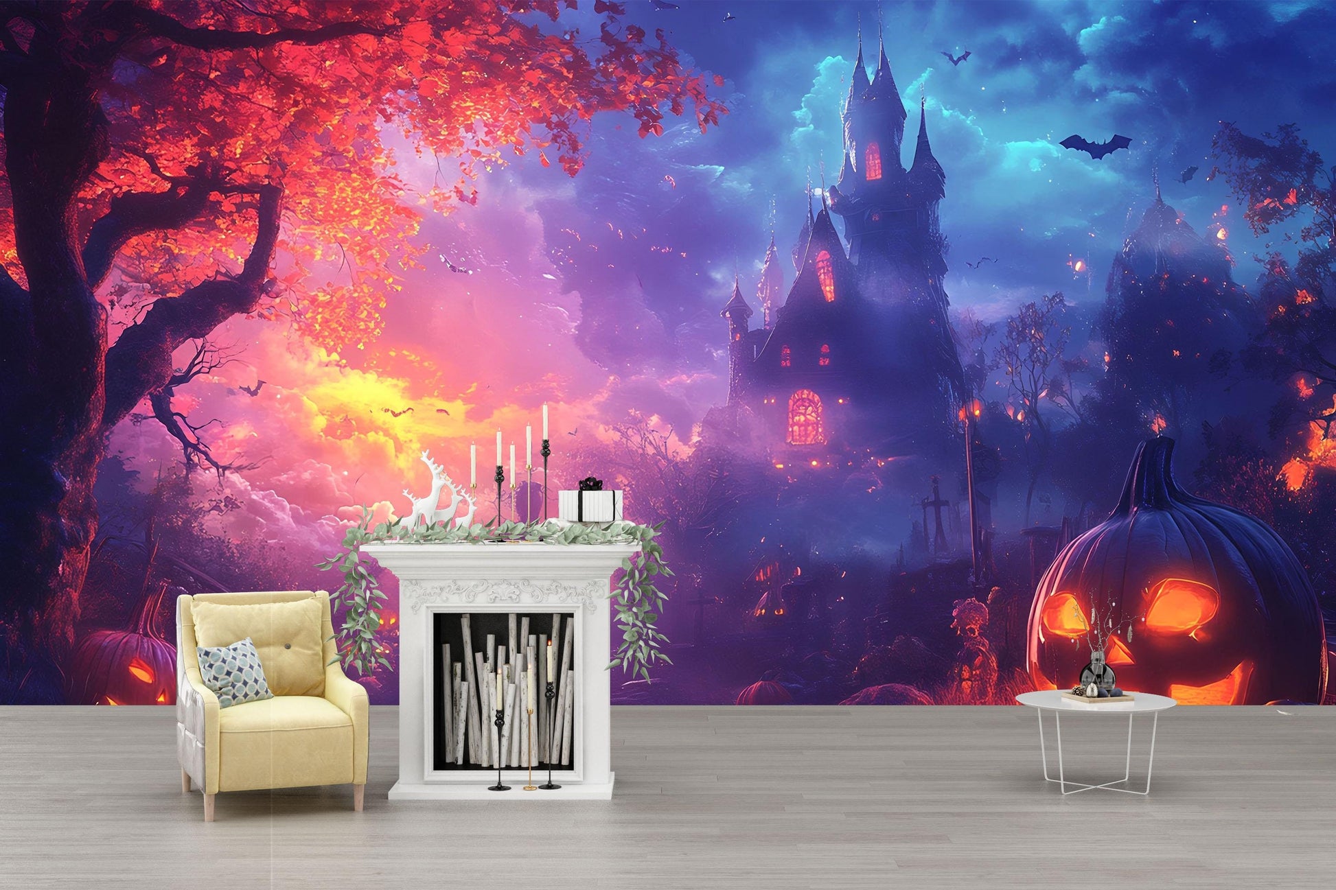 Colorful Halloween Castle Wall Mural – Spooky Kids Room Décor