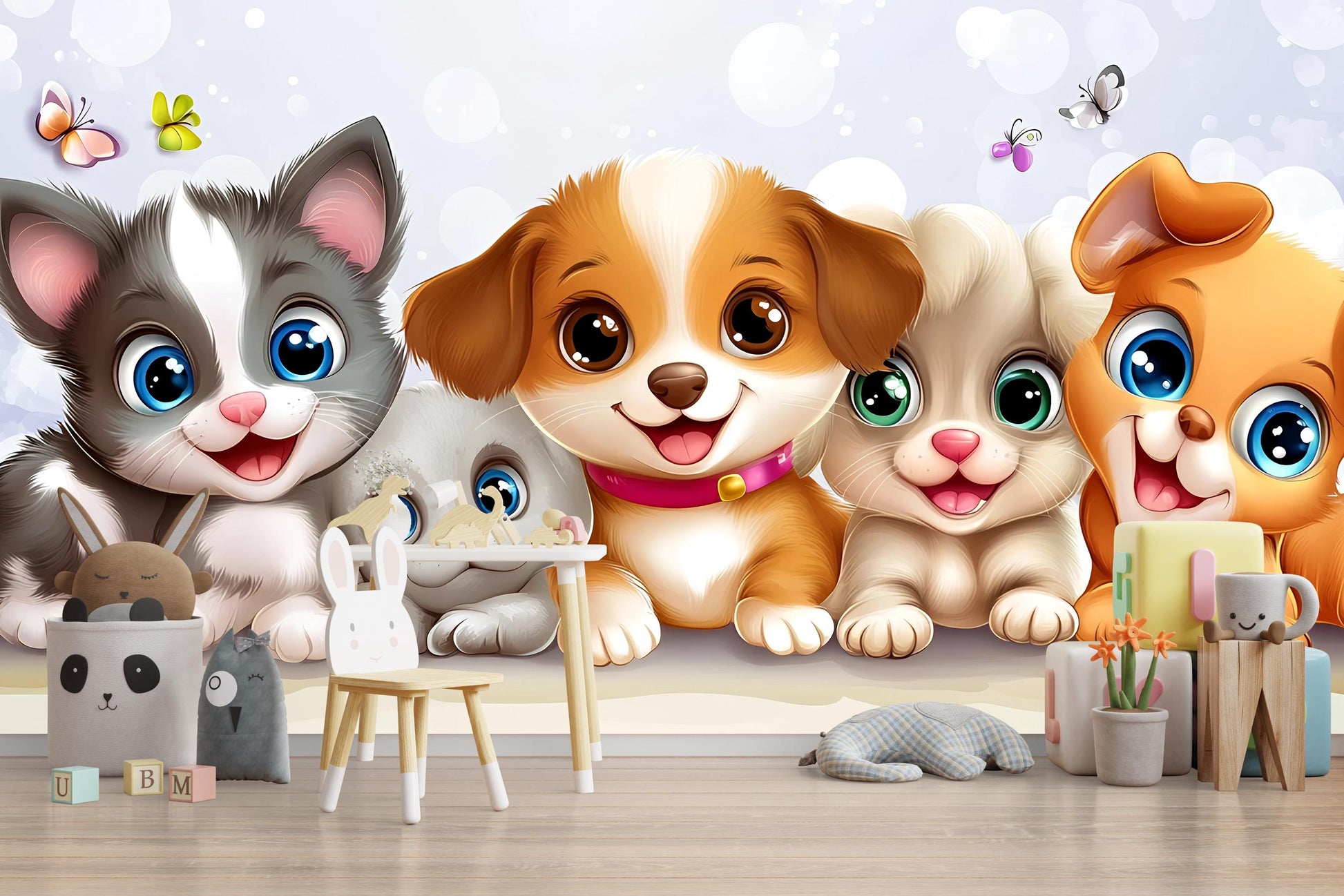 Transform your child's room with this vibrant and adorable puppy and kitten wall mural! Featuring a group of big-eyed, cartoon-style animals, this removable wallpaper adds a playful and cozy vibe to any nursery, playroom, or toddler bedroom. The colorful and friendly faces of puppies and kittens make it perfect for animal-loving kids and baby décor themes. Easy to apply and remove, this wall art is ideal for renters or anyone wanting to refresh their space with minimal effort.