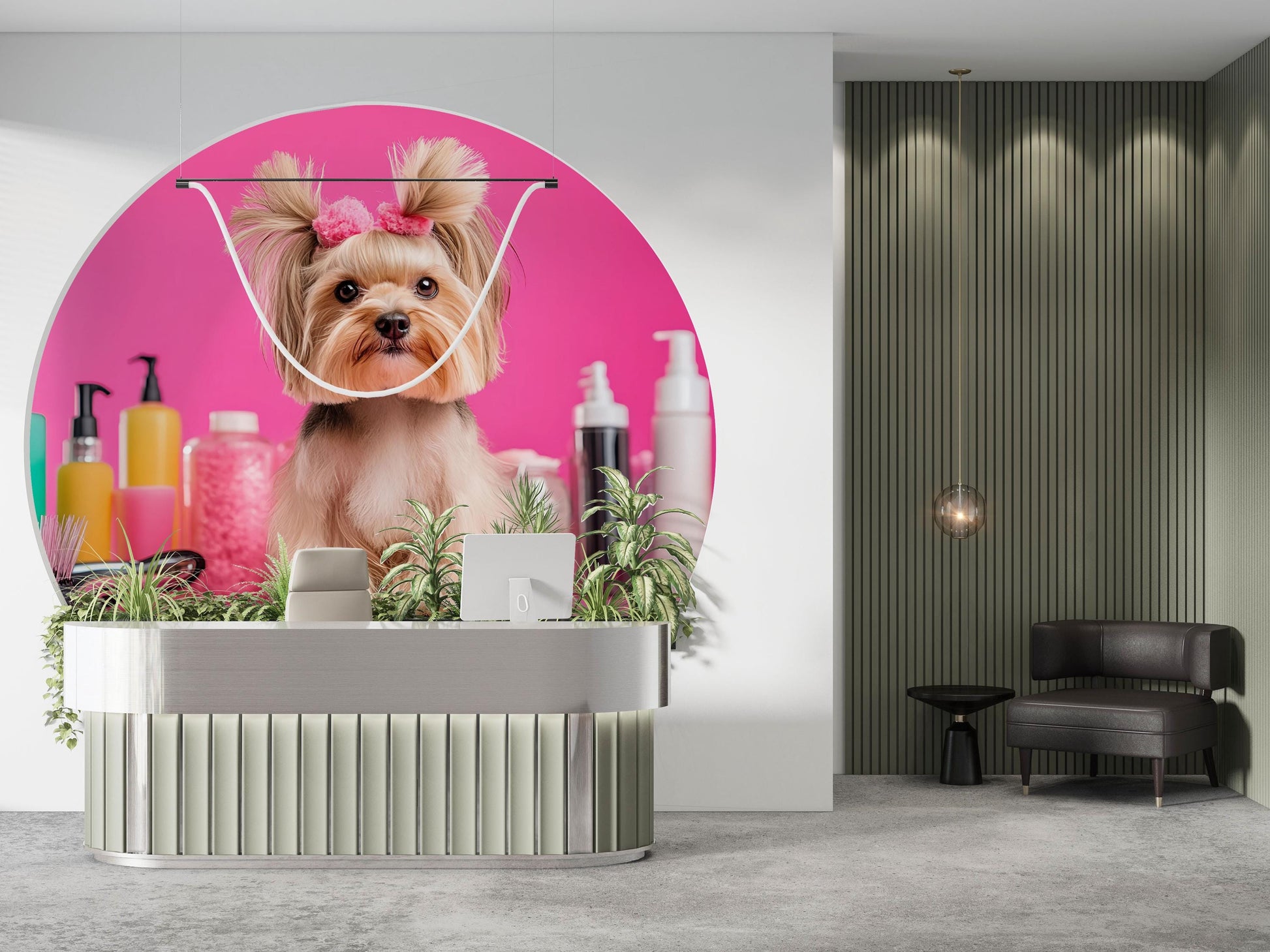 Transform your pet grooming space or salon with this adorable Yorkie dog wall mural! Featuring a stylish Yorkshire Terrier with pink bows against a vibrant pink background, this large-scale wallpaper design adds charm and personality to any room. Ideal for pet boutiques, grooming salons, doggy daycares, or even kids' bedrooms, the mural includes grooming products and salon elements that make it both playful and professional. Printed in high resolution for crisp, eye-catching results. Available in multiple sizes. Easy to apply and remove.