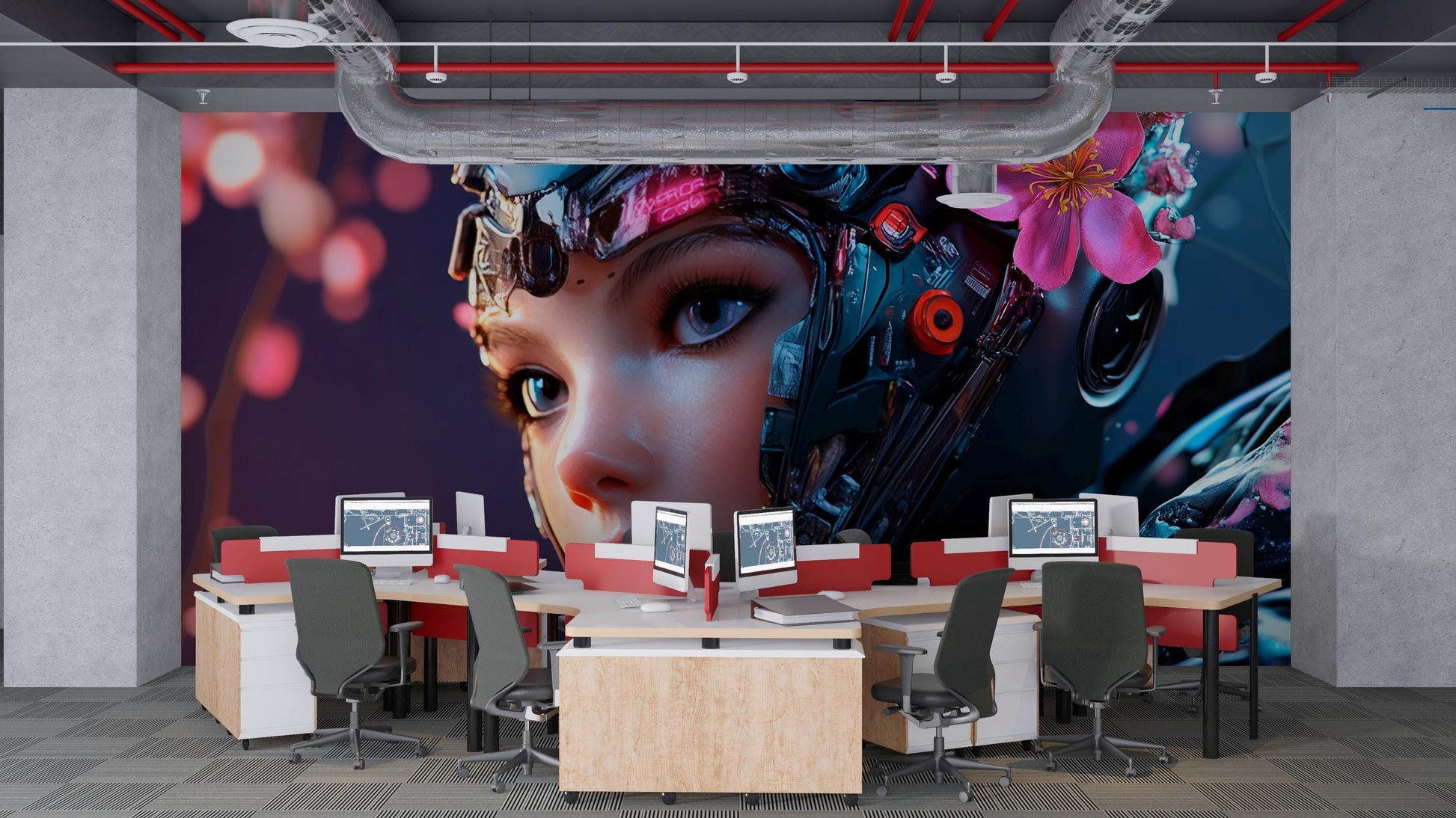 Transform your workspace with this stunning cyberpunk wall mural featuring a hyper-detailed AI girl with cybernetic enhancements. Ideal for tech lovers, gamers, and fans of futuristic or sci-fi aesthetics. The vibrant digital art adds depth and intrigue to any office or creative space. Printed on premium wallpaper material, this mural is easy to install and designed to inspire.