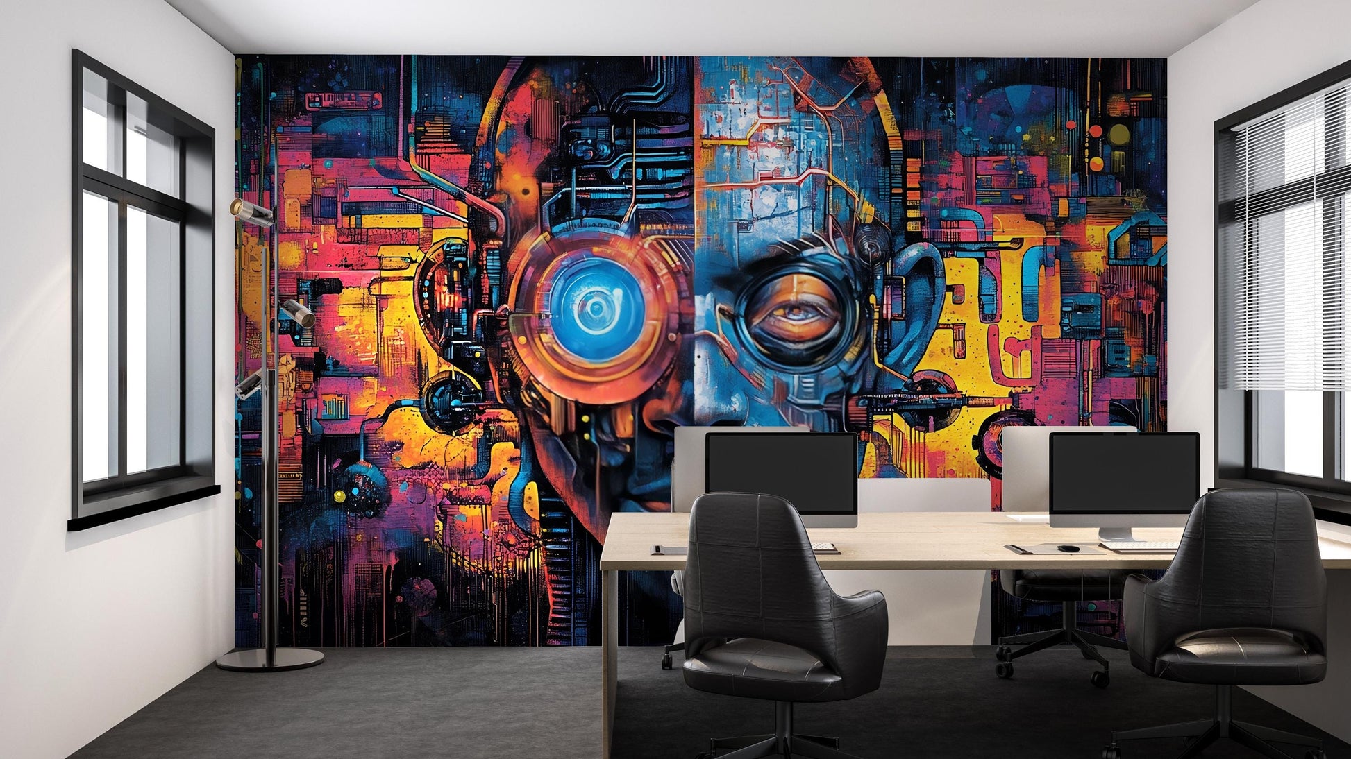 Cyberpunk AI Wall Mural – Futuristic Office Art, Sci-Fi Robot Face Design