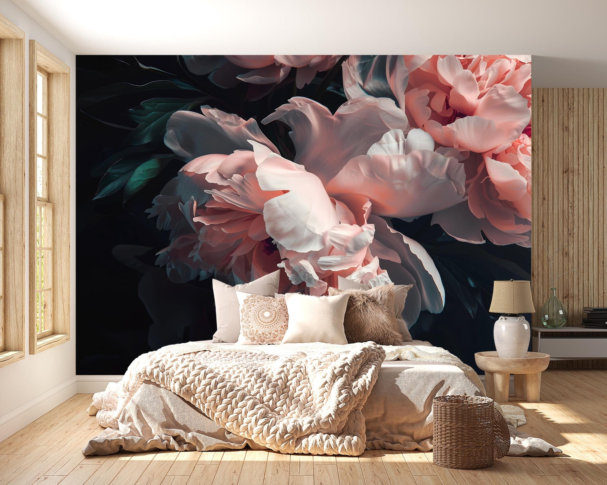 Dark Floral Mural Wallpaper – Large Pink Peony Wall Art for Bedroom Décor