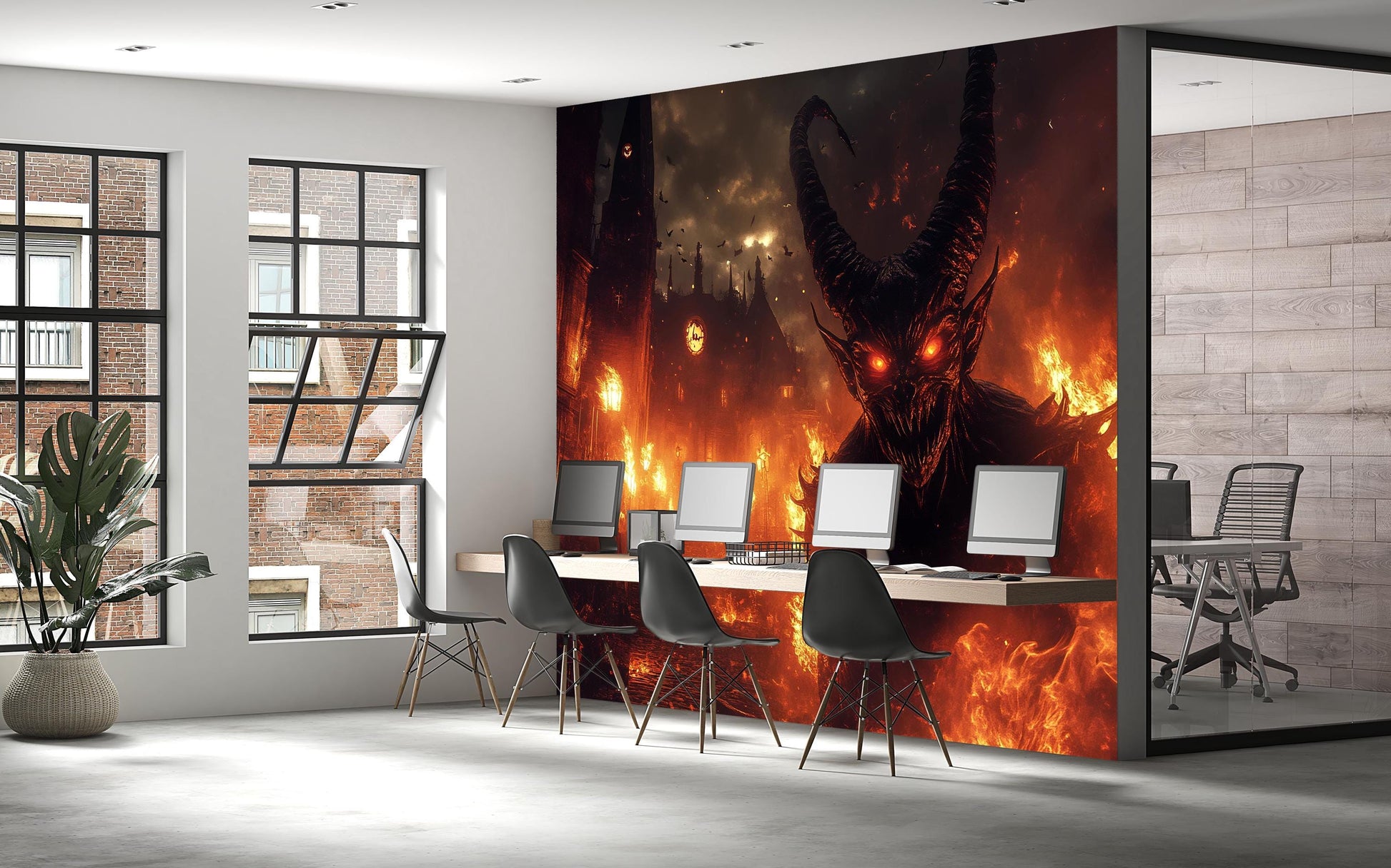 Demonic Wall Mural – Fiery Hell Scene with Red-Eyed Monster