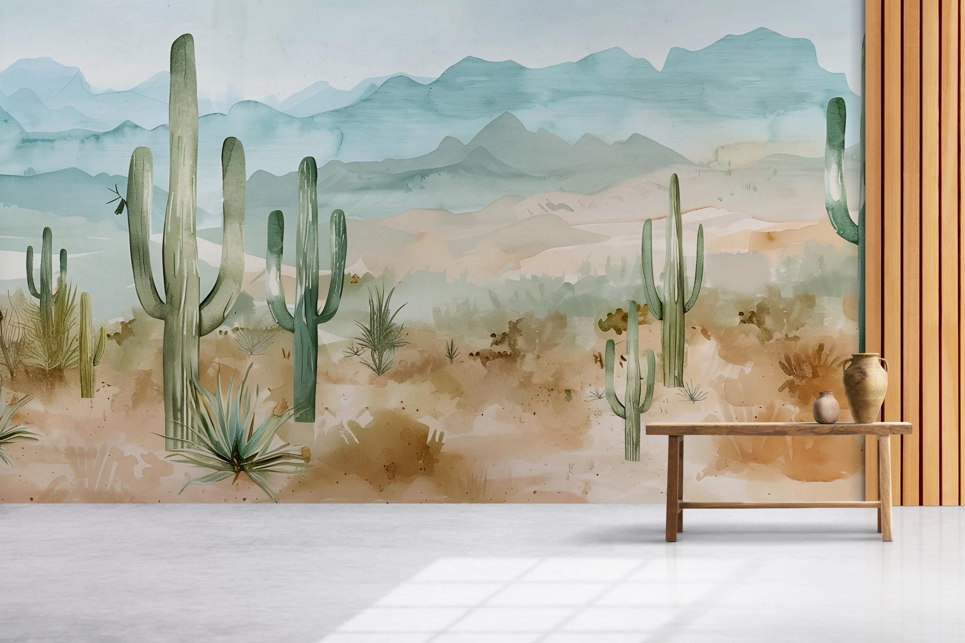 Desert Cactus Wall Mural – Southwestern Mountains Boho Wallpaper