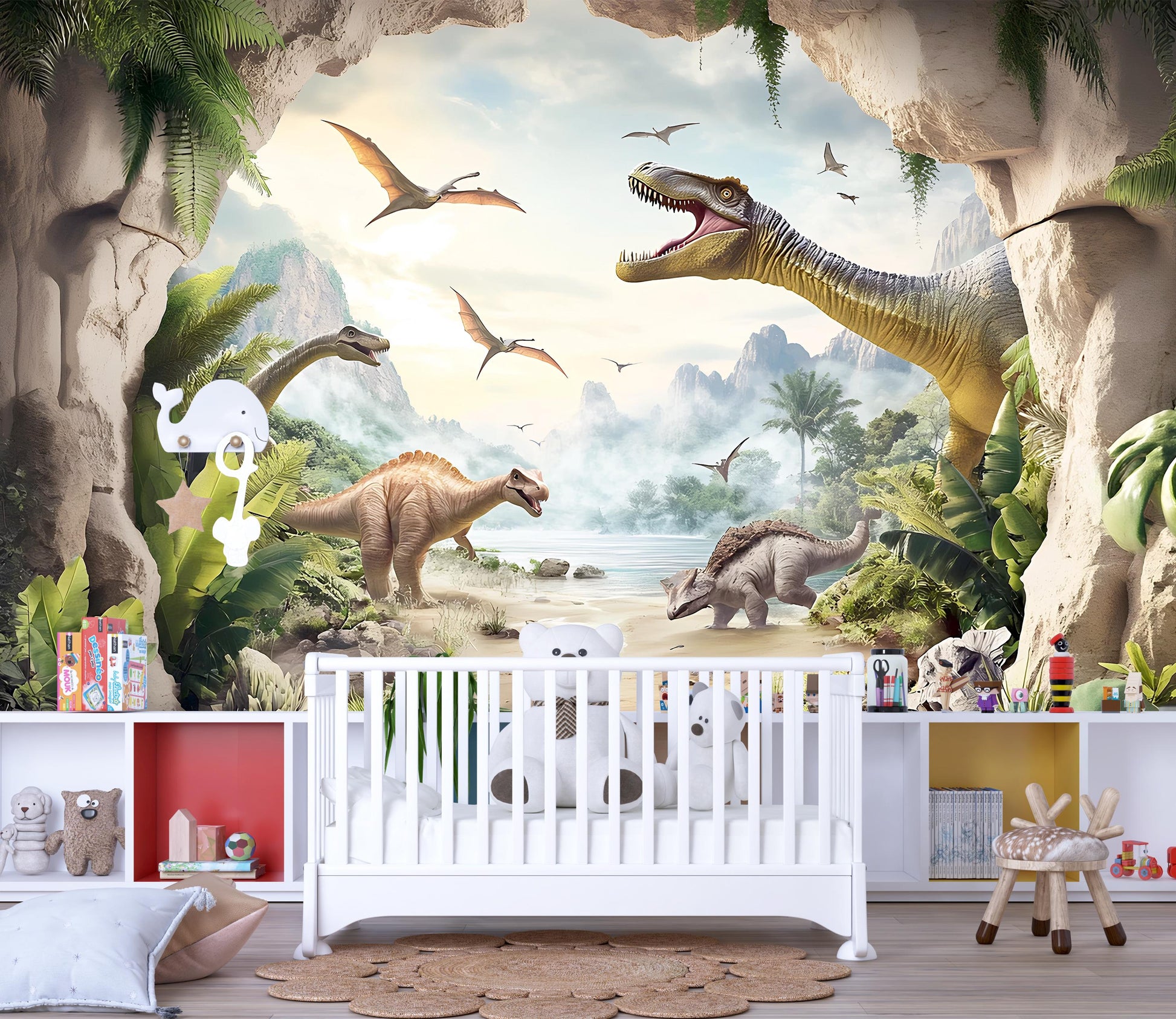 Bring the Jurassic era to life in your child's room with this stunning dinosaur nursery wall mural! Featuring a vivid prehistoric scene with lifelike dinosaurs, flying pterosaurs, lush jungles, and a peaceful lakeside view, this mural creates a captivating and adventurous environment perfect for your little explorer.