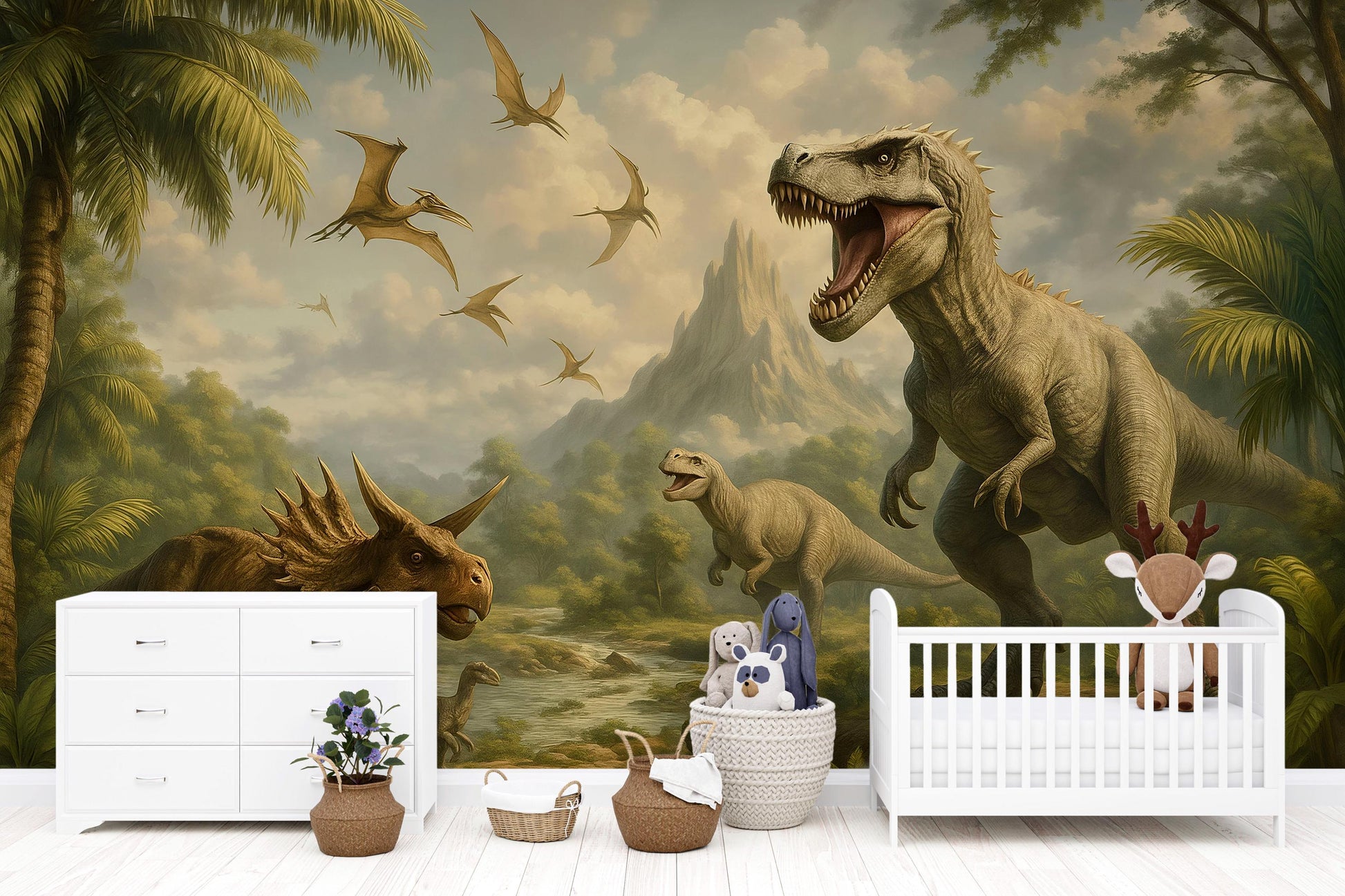 Turn your child’s room into a prehistoric adventure with this stunning dinosaur nursery wall mural! Featuring a roaring T-Rex, Triceratops, flying Pterodactyls, and jungle scenery, this mural sparks imagination and brings the Jurassic world to life.