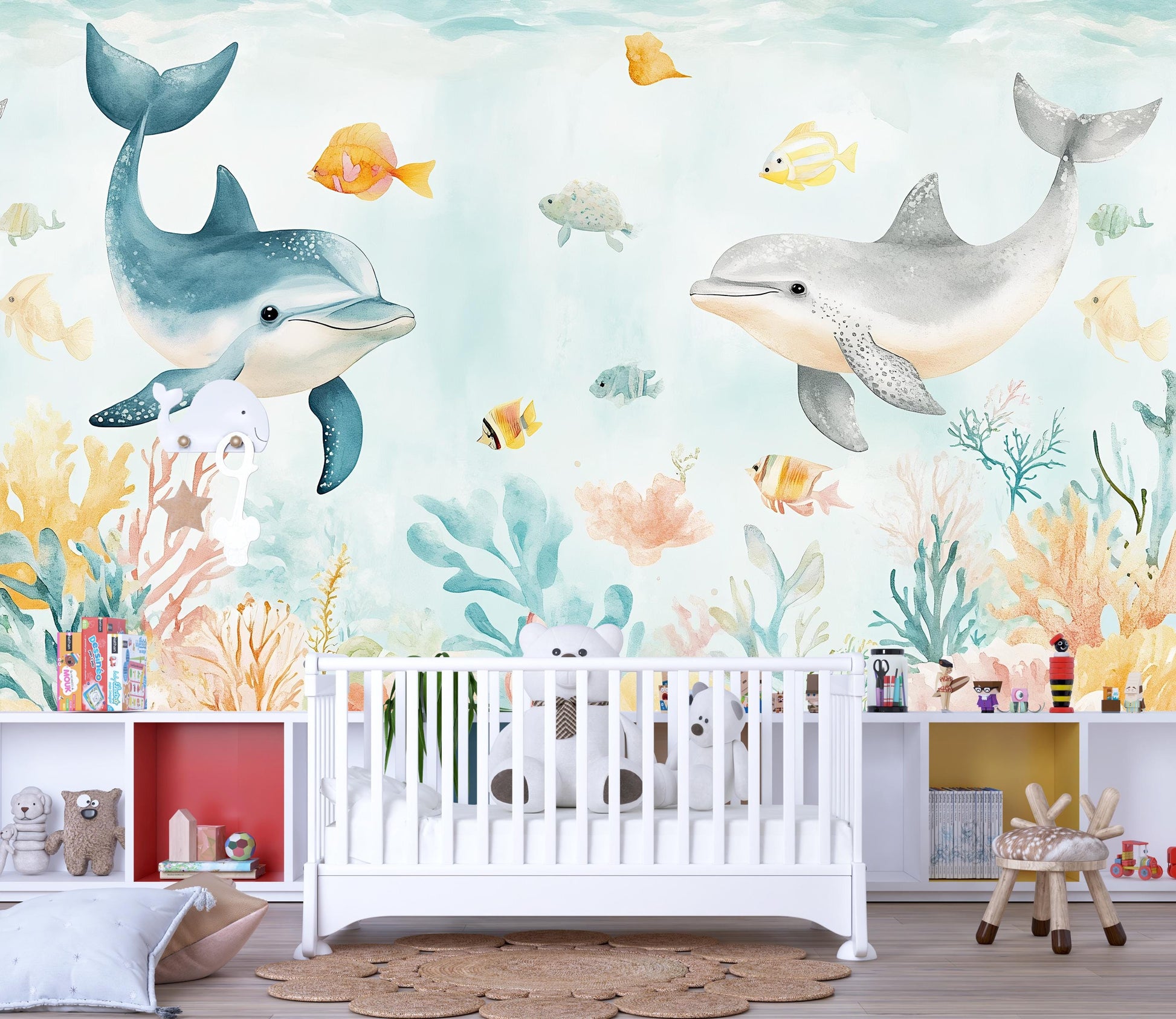 Dolphin Wall Mural – Underwater Ocean Nursery Wallpaper with Sea Turtle & Fish