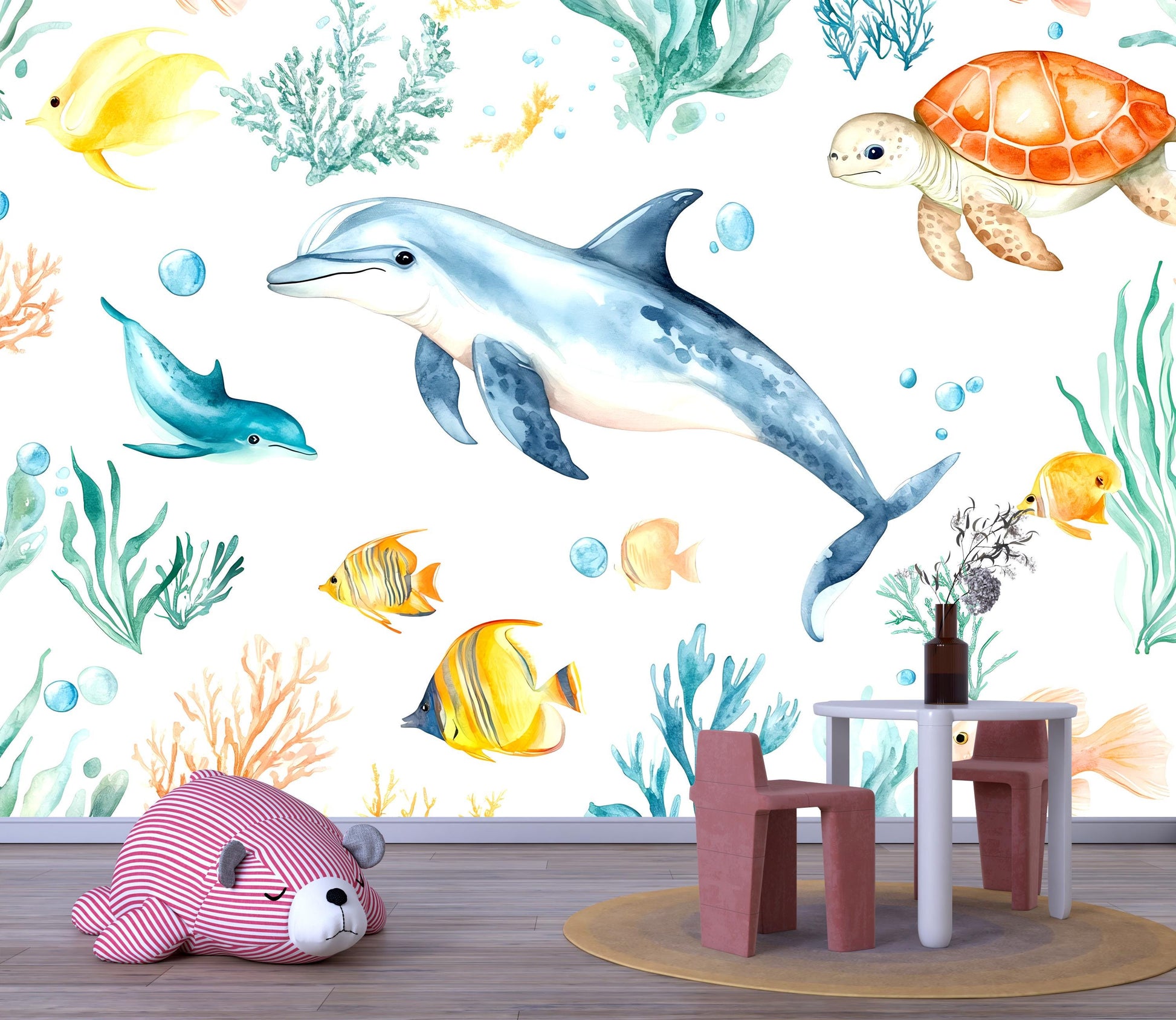Dolphin Wall Mural – Ocean Nursery Wallpaper with Sea Turtle & Tropical Fish