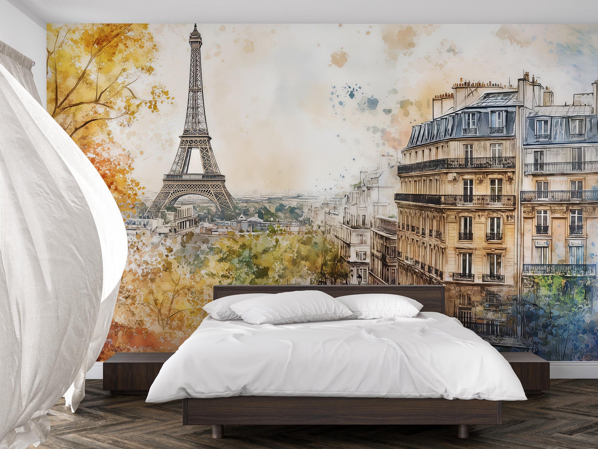 Transform your walls with this Eiffel Tower watercolor wall mural, featuring a stunning view of Parisian streets with autumn leaves, classic Haussmann buildings, and the iconic Paris skyline. The artistic watercolor design blends elegance with romance, making it a perfect addition to living rooms, bedrooms, offices, or cafés. Bring the magic of Paris into your home and enjoy the timeless charm of France’s capital.