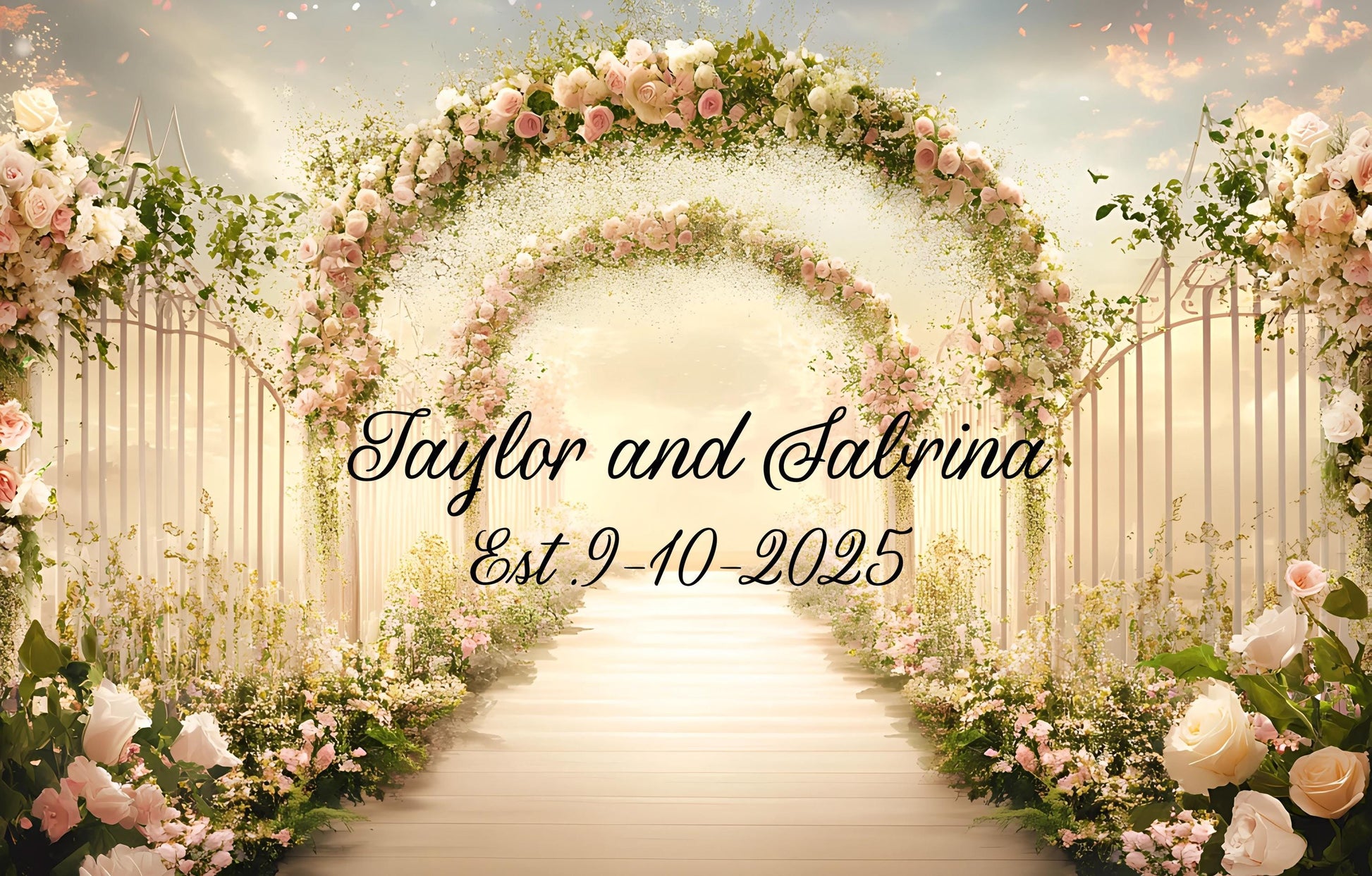 Celebrate your special day with this stunning custom floral wedding backdrop sign, beautifully adorned with pastel rose arches and lush greenery. Featuring your names and wedding date in an elegant script, this romantic scene sets the perfect tone for ceremonies, receptions, photo booths, or anniversary celebrations.