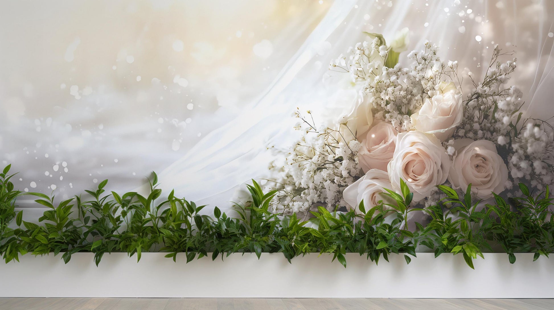 Create a breathtaking ambiance with this Elegant White Rose Wedding Backdrop. Featuring lush greenery, delicate baby’s breath, and soft white roses, this romantic photo wall is perfect for weddings, bridal showers, engagement parties, or any elegant event. The gentle soft-focus bokeh and flowing veil background add a dreamy, romantic aesthetic that enhances every moment. Printed in high resolution for a stunning, realistic effect, it works beautifully as a photo booth backdrop or ceremony wall decor.