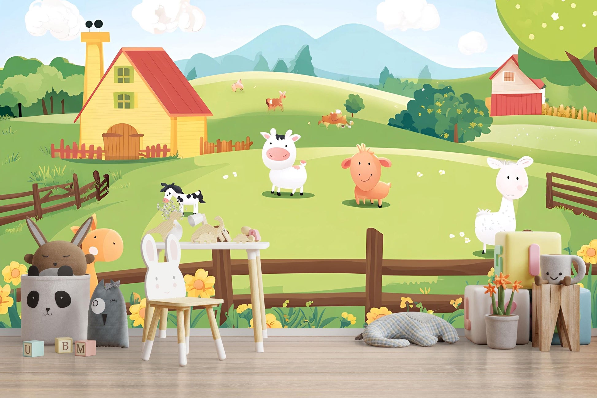 Farm Animal Wall Mural for Kids Room, Cartoon Pasture Wallpaper, Nursery Farm Decor, Cute Barnyard Wall Art