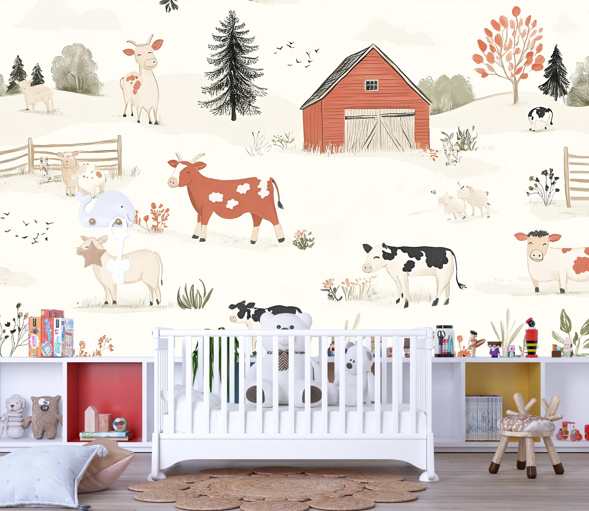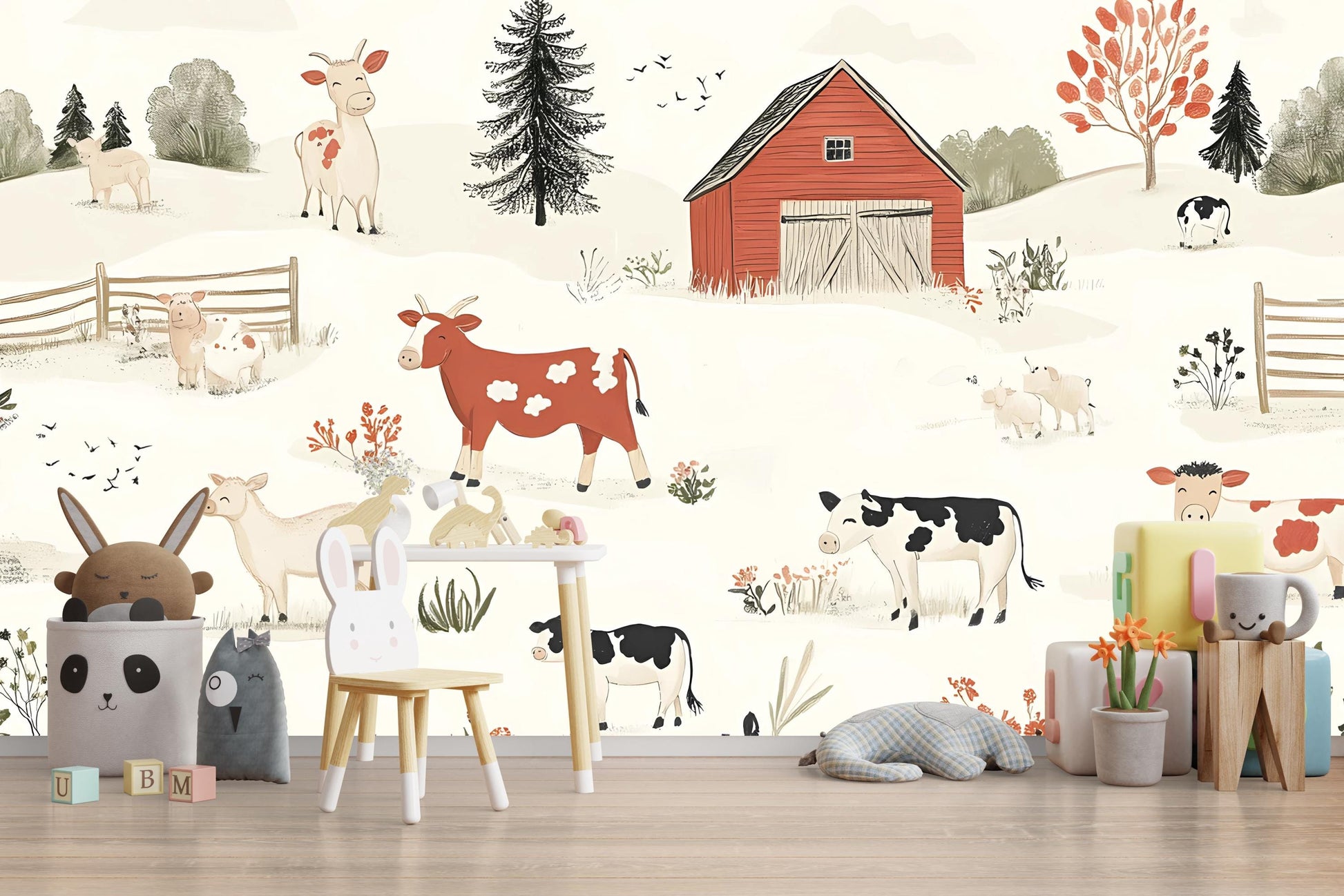 Farm Animal Wall Mural for Kids Room – Cute Cow Barn Nursery Wallpaper – Removable Playroom Decor – Country Farmhouse Art