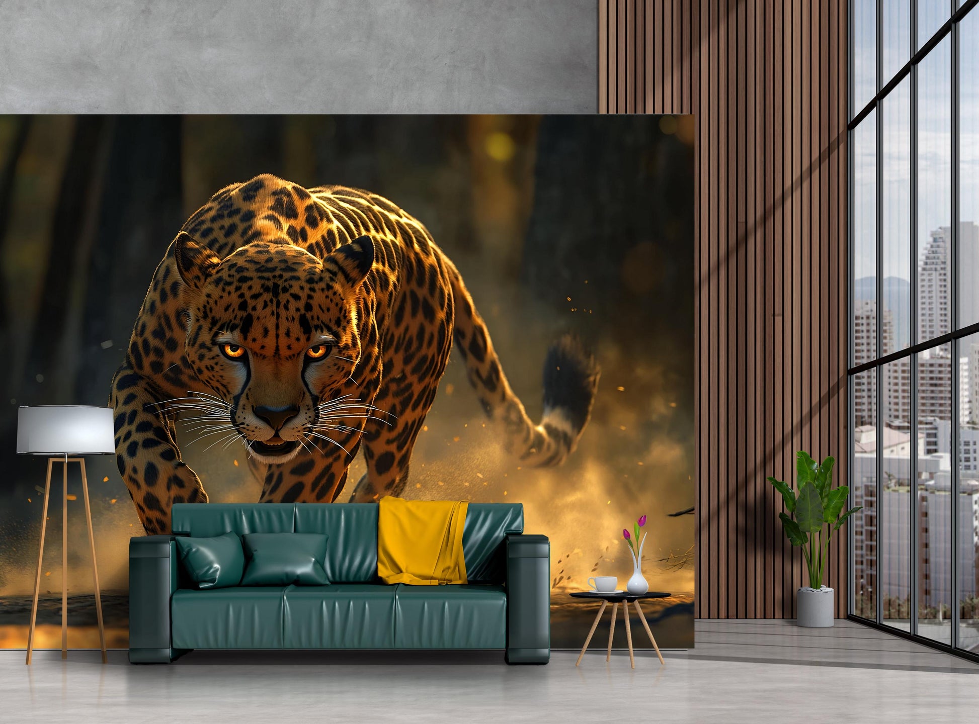 Fierce Leopard Jungle Wall Mural – Large Wild Cat Art for Living Room – Jungle Predator Wallpaper for Home Decor