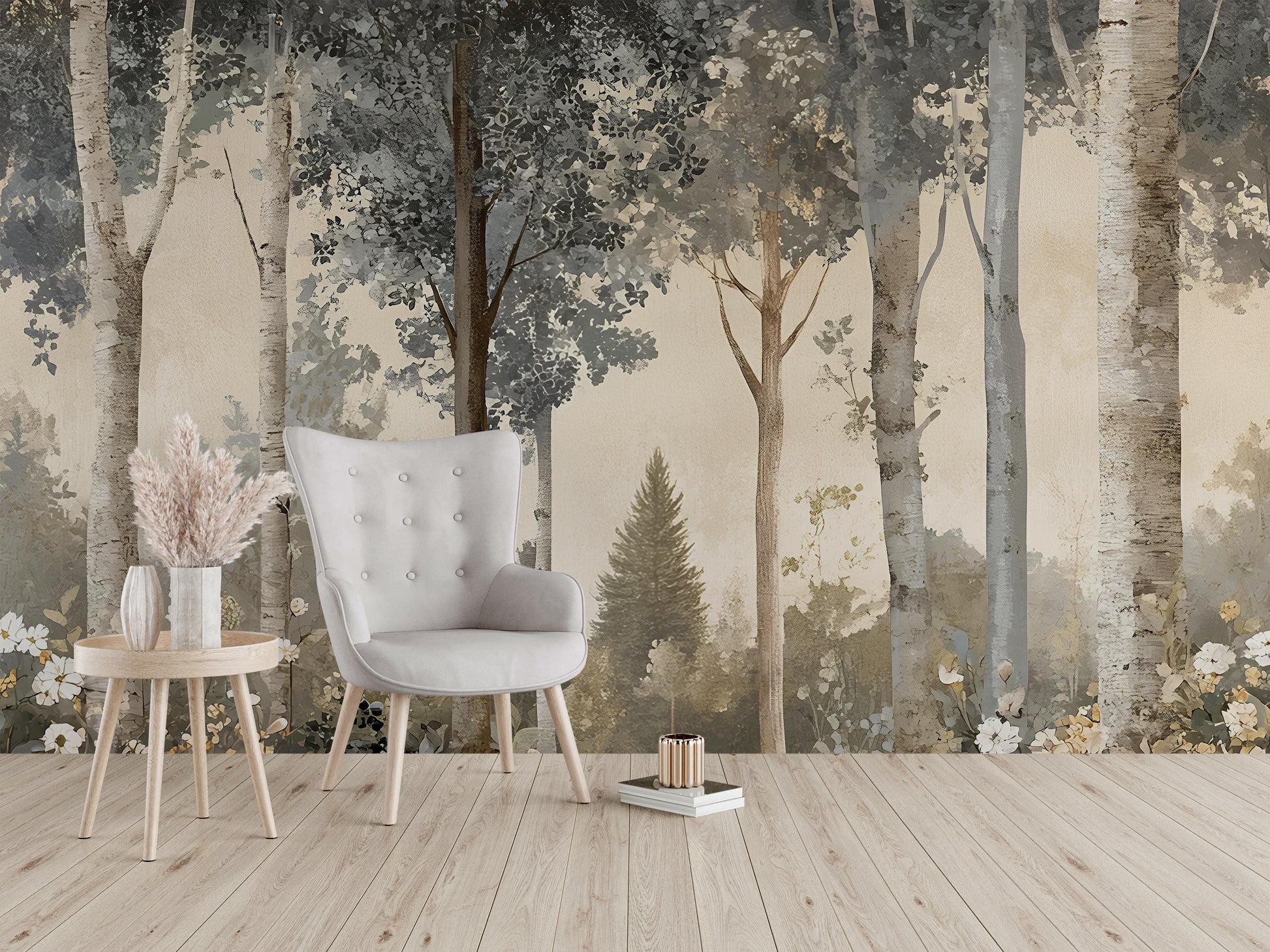 Forest Wall Mural – Neutral Tree Wallpaper, Scandinavian Nature Wall Art, Large Woodland Removable Mural