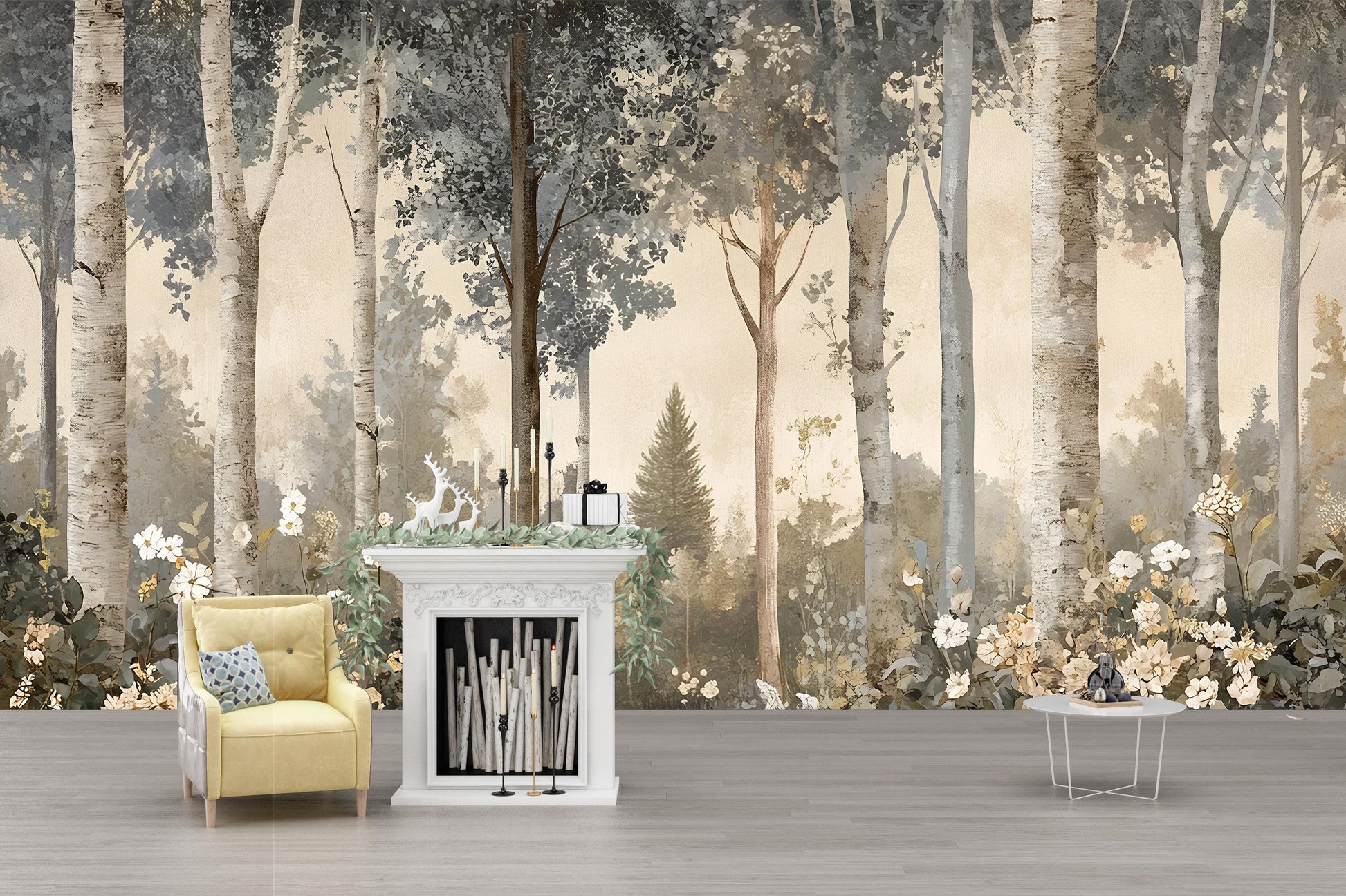 Forest Wall Mural – Neutral Tree Wallpaper, Scandinavian Nature Wall Art, Large Woodland Removable Mural Vn248