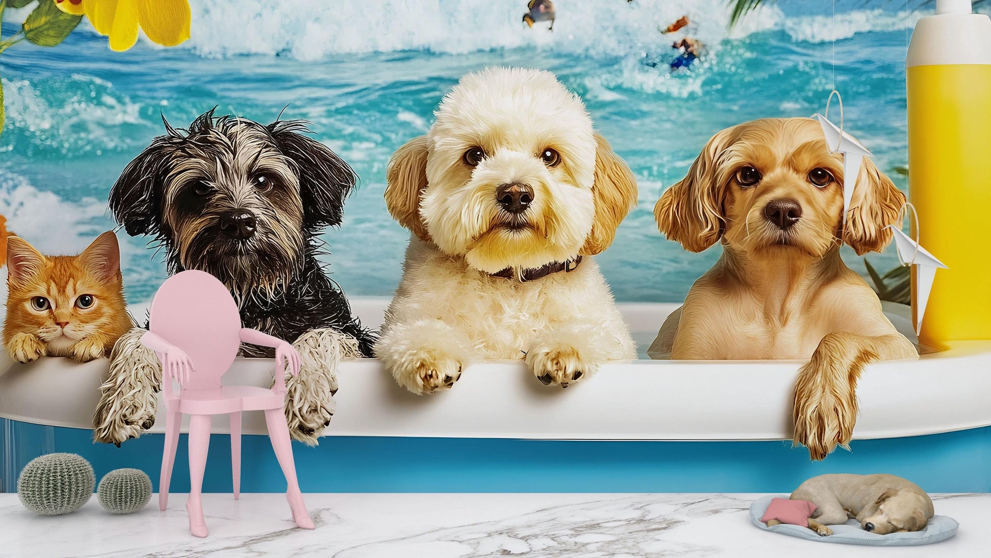 Bring a splash of joy to your bathroom or living space with this whimsical wall art featuring adorable dogs and a cat lounging in a bathtub by the beach. Perfect for pet lovers, this high-resolution digital print adds humor, charm, and a coastal vibe to any decor. Great gift for dog moms, cat dads, or anyone who loves quirky animal art!