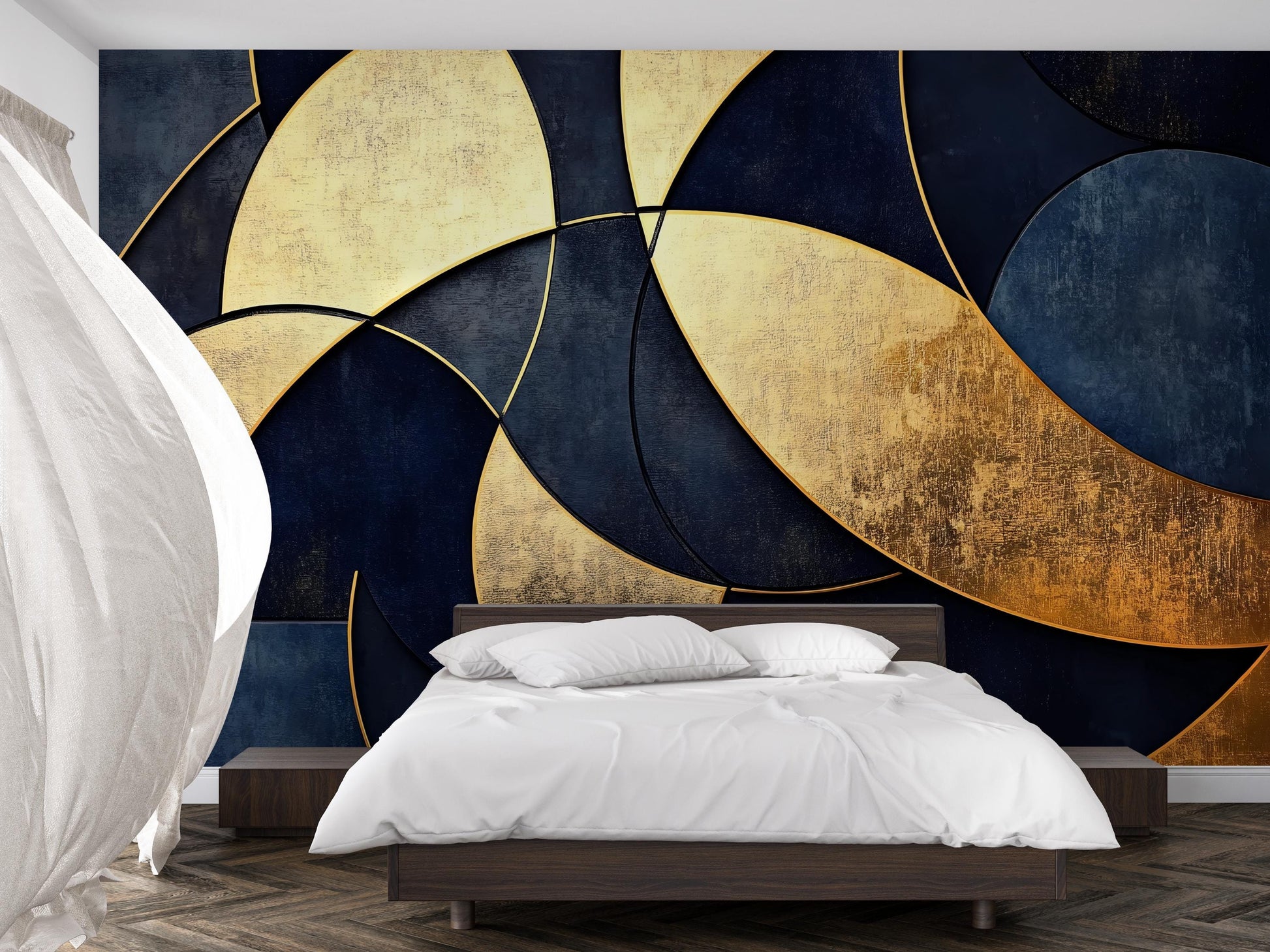 Elevate your space with this luxury abstract wall mural, featuring a bold gold and navy geometric design. The sweeping arcs and modern textures create a rich statement wall perfect for bedrooms, living rooms, offices, or upscale interiors.