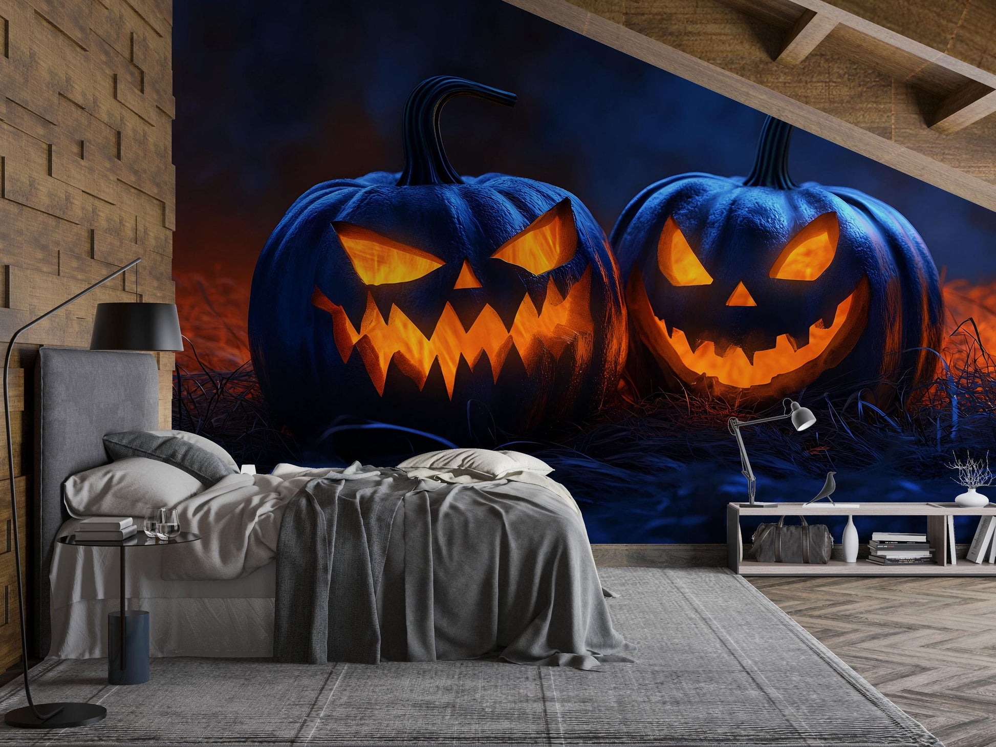 Set the perfect spooky mood with this Halloween jack-o’-lantern wall mural. Featuring two glowing carved pumpkins with menacing grins against a dark and fiery backdrop, this high-resolution design is ideal for Halloween parties, themed offices, retail displays, or seasonal home decorating. The vibrant orange glow contrasts dramatically with the deep blue shadows, creating an eye-catching statement wall. Available in peel-and-stick or traditional paste application, it’s easy to install and remove, perfect for both renters and business spaces.
