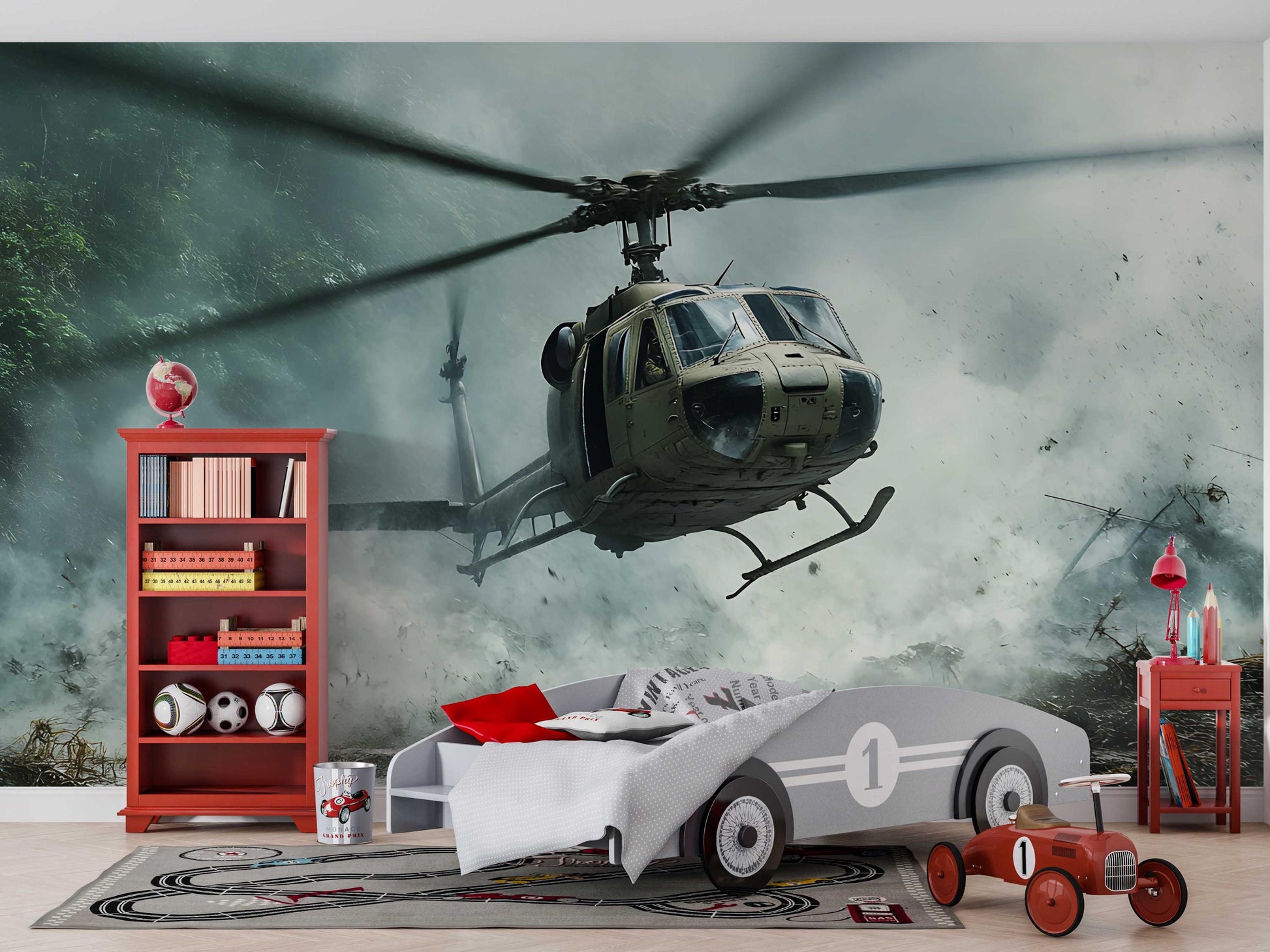 Transform your child's room into an action-packed adventure zone with this epic helicopter war scene wall mural. Featuring a realistic UH-1 Huey chopper flying through a dynamic battlefield, this wallpaper is perfect for boys who love helicopters, military history, or aviation. Made with high-quality materials and vivid details, this mural adds a bold and immersive element to any bedroom, playroom, or gaming space.