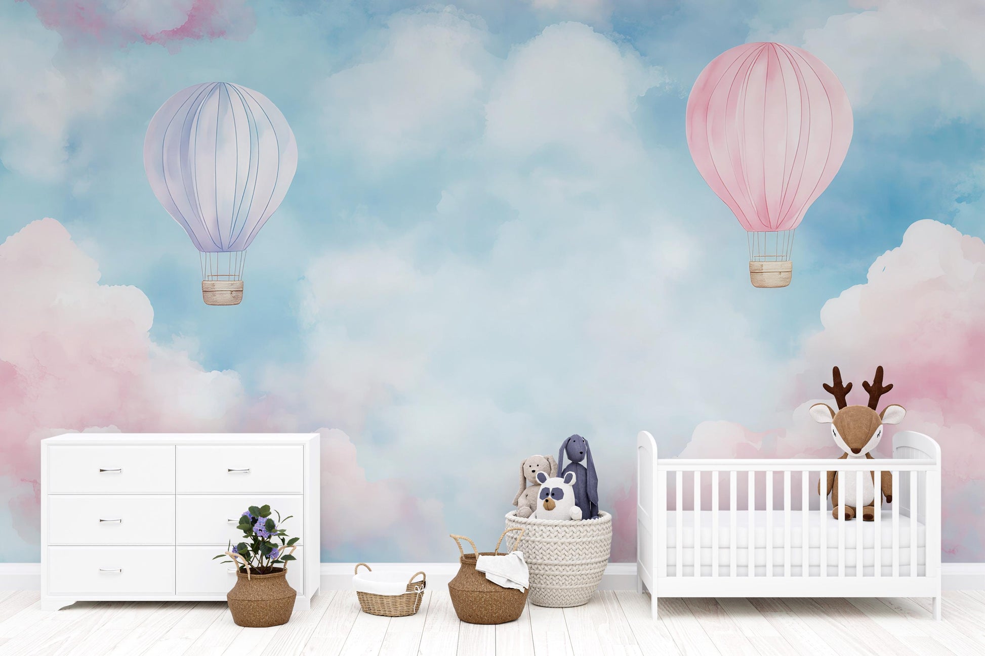 Bring a touch of dreamy magic to your child’s room with this hot air balloon wall mural. Soft pastel pink and purple balloons float through watercolor clouds on a calming blue sky, creating the perfect whimsical setting for a nursery, playroom, or kids’ bedroom.
