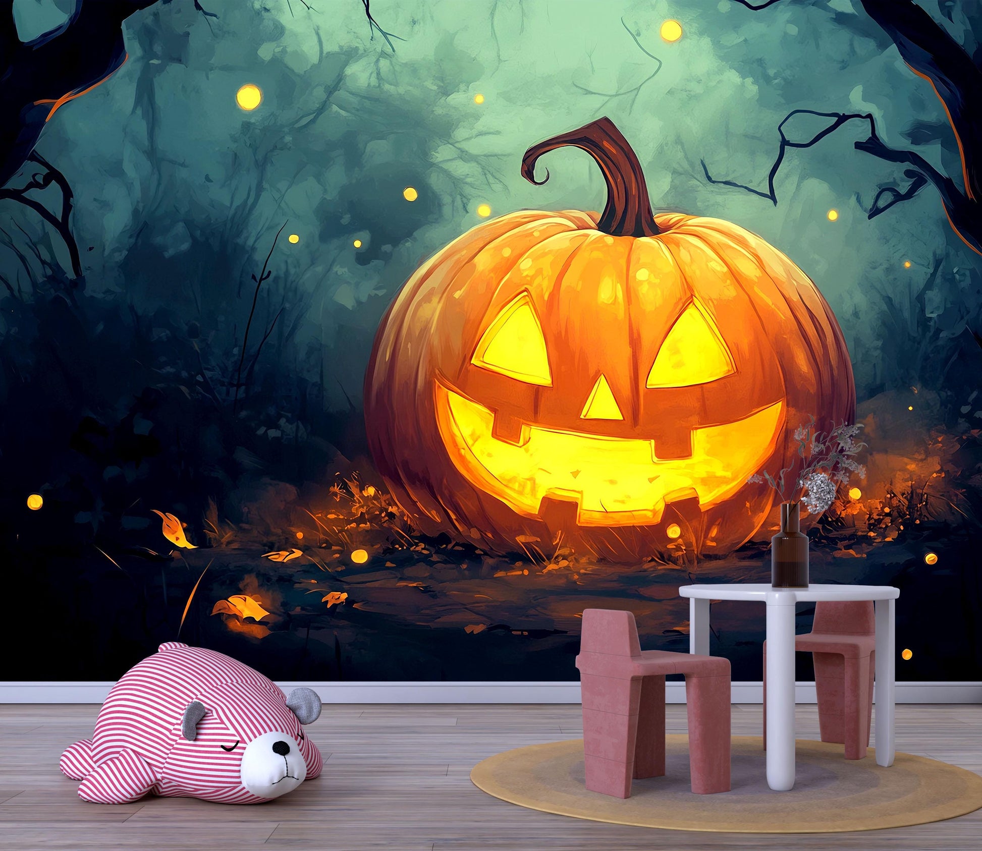 Bring Halloween charm into your home with this glowing Jack-O’-Lantern Wall Mural. Featuring a friendly carved pumpkin in a misty forest illuminated by warm lights, it’s perfect for living rooms, seasonal parties, and autumn decorating. The rich, inviting colors create a cozy fall atmosphere. Available in peel-and-stick or traditional wallpaper for easy installation and removal.