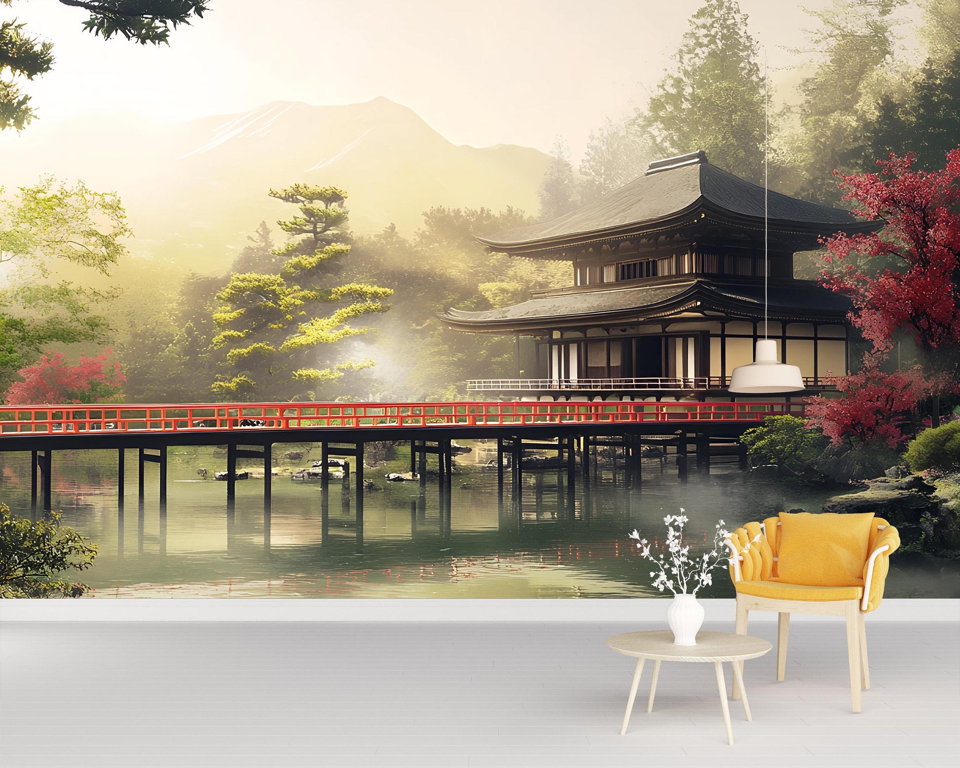 Japanese Temple Wall Mural – Tranquil Zen Garden Wallpaper for Living Room or Office Decor